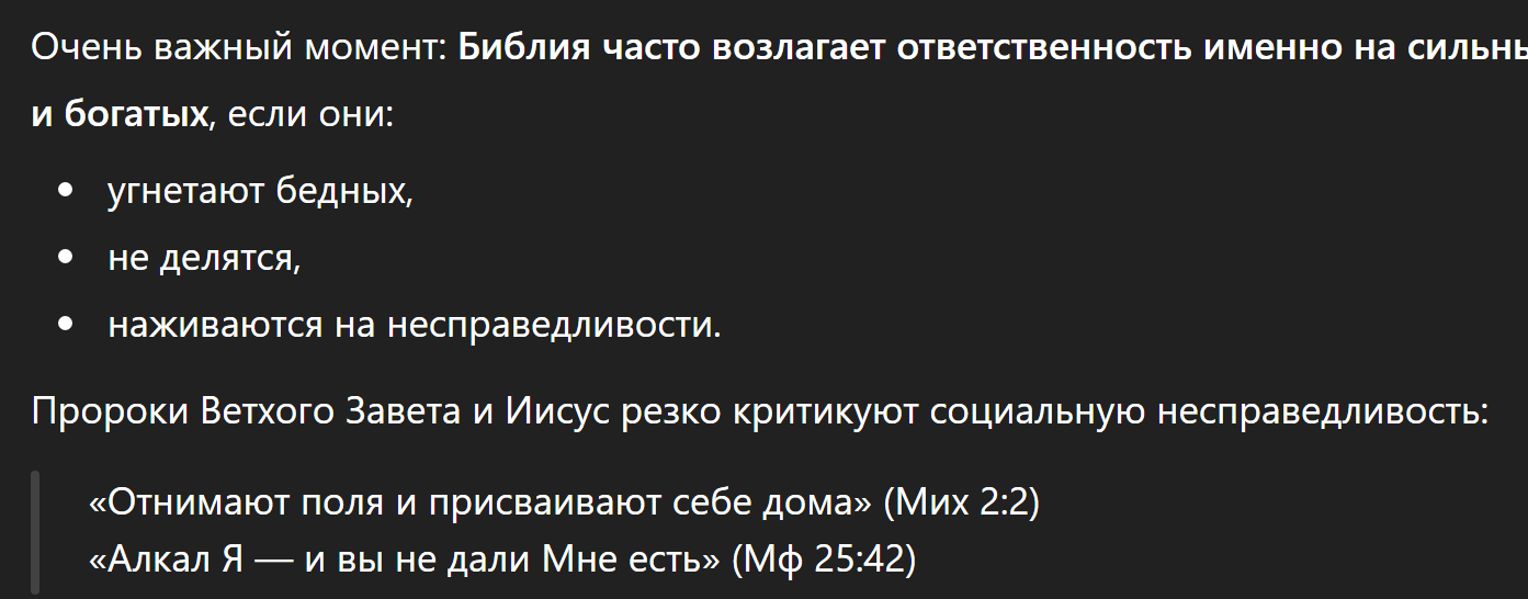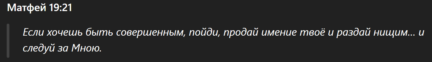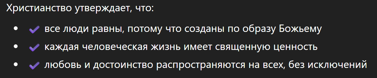 >Христианство постулирует, что жизнь любого человека священна просто потому что. Это ложь, буквально нет. Визгуша просто не знает ничего про христианство ни с точки зрения воцерковленного человека, ни с точки зрения какого-нибудь стороннего теолога/богослова. Любой, кто читал Библию, понимает, что тезис "жизнь любого человека священна" выдуман школьником. У христиан, все, что священно и все, кто священен, буквально пронумерованы в специальных и/или богодуховенных книгах и Библии, а так же согласованы между христианскими организациями в какой-то степени. Никаких "священных жизней" в этих книгах нет. Да и с точки зрения хотя бы базовой катехизации ни один христианин не понимает жизнь, как что-то священное. Я тебе подскажу: отобрать жизнь - лишить человека возможности покаяться, буквально все на этом. А для того, кто отобрал жизнь - это подпадает под смертный грех и если человек отнял жизнь - душа отнявшего полна страстей и пороков, человек ожесточил сердце и даже недостаточно искреннее покаяние будет воспринято как "хула на Духа Святого". В общем, визгуша выдумала "Христианство постулирует, что жизнь любого человека священна". Как бы на жизнь земную христианам похуй вообще строго говоря, жизнь дольняя понимается как страстная, испытание для души, с чем христиане борятся - умерщвляют свою плоть и отказываются от страстей. Try harder, юноша. >Это безусловная валидация, олигофрен. Даже, мы возьмем тезис визгуши про "жизнь священна" (а визгуша ничего не смыслит в христианстве буквально и у христиан жизнь священной не является), то постулат "жизнь священна" никак не валидирует христианина в измене/разрушении брака/лжи. То есть, выдуманный визгушей тезис про "жизнь священна" никак не выливается в некую "безусловную валидацию" любых действий христиан, лол. Это ни логически неверно (не отвечает логике), ни фактически неверно (тезис про "жизнь священна" отсутствует у христиан).