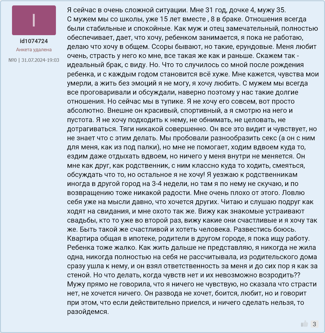 То уже другой анон спрашивал, но всё же >О том, что отношения - это взаимное удовлетворение потребностей Женщину это не интересует. >Если баба вечно устает, болит голова или ей не хочется - это говори о прососе по показателям Женщину это не интересует. > ну как бы да, должна. куда мне еще присунуть? дрочить, потому что ты не хочешь заниматься собственными головой и здоровьем? По-мимо если она даже будет на серьезе слушать - на ответ "мне все равно" или бездействие у тебя нет никаких рычагов, кроме измен либо "терпения". >Научись не виноватить, а говорить о будущем. Задавай неудобные вопросы, используй я-высказывания. Всё это полезно в контексте предсказывания что она будет делать завтра-через месяц- через год, но не в контексте манипуляции-воспитания. Женщина будет делать все если любит (гормоны бушуют) по-умолчанию, и ничего если этих гормонов уже нет. Тут годен только совет "берите взамуж бабу-девственницу или максимум до 3ёх половых партнеров", т.к. именно у таких этих гормонов будет с вами максимально продолжительное время, плюс легко вызываемые походами в какое-то доступное место (где она не была с сотней других мужчин тысячи раз).