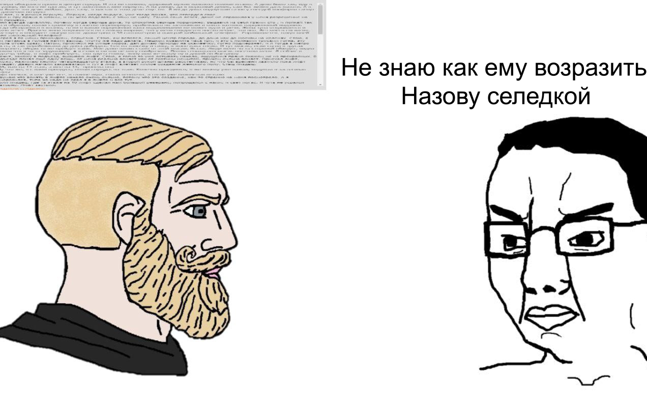 >>10494696 >Перед нами не теория, а дневник эмоций человека Cудя по написанному, это не теория, а >мыль проста Где ведётся мыслительная дискуссия. >который обвиняет других Нет ни слова обвинения или требования кому-то как себя вести. >«Им нравится — значит правда»… сказал человек, которому не нравится Весь текст посвящен поиску истины, а не вешанию ярлыков или делёж на правых/неправых. >Это не анализ людей, это набор карикатур, которые удобно пинать. Люди закономерно в одних и тех же ситуациях поступают... закономерно. Так уж вышло, что женщина в татухах - в 95% шлюха или ебанутая. Это даже HRы знают, но ты бы и до них доебался. >Психологи, комьюнити, валидация — всё плохо, кроме автора Ну так ты соврал про автора, он не говорил, что он хорошо. Ты же для убедительности то тут то там пытаешься очернить своими додумками. >Но сам автор:не допускает возражений, не проверяет свои выводы, заранее знает, кто прав, объявляет себя носителем «безупречного механизма» Когда покажешь где он это все недопускает, где кого судит кто прав а кто нет, где называет себя "носителем механизма" - тогда выдадим тебе диагноз. >Автор обвиняет других в мышлении «нравится / не нравится» Сказать не равно обвинять.