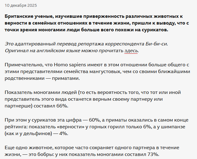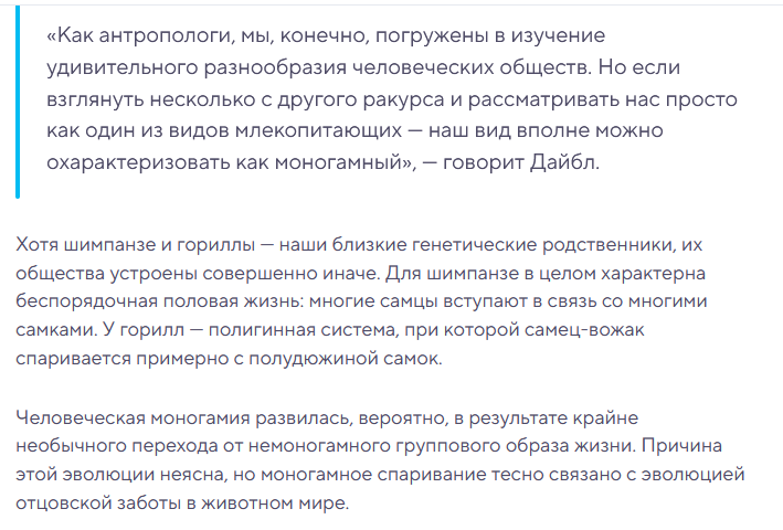 >>10517349 Нет. Про клыки извини, конечно, но это глупость вопиющая - у человека прикус и состав зубов менялись из-за питания, а не из-за удивительного женского выбора. Далее. Серийная моногамия предполагает, что одни отношения заканчиваются, как только перестают устраивать, и начинаются другие. Не смотря на моральную корректность этой модели, она биологически невыгодна, как раз по причине, описанной тобой: >женщины выбирали не самых сильных и агрессивных, а способных в ежедневную поддержку и заботу о ней и ребёнке. Потому что люди не в силах вырастить потомство в одиночку.