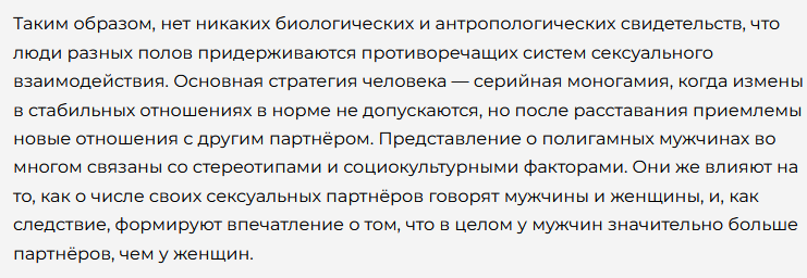 При серийной моногамии мужчина, как только ему чего-то не хватает в отношениях, говорит молодой мамочке "покеда" и оставляет её с тем самым потомством в одиночестве как это, кстати, зачастую и происходит. При полигамии мужчина предпочитает оставаться в семье, поскольку это бытовое обслуживание и "ощущение, что дома кто-то ждёт" (буквально мужское объяснение неухода из семьи) и гулять на стороне. Даже если он в этих сторонних связях не делает детей, эта тяга к блядству связана именно с потребностью размножится дальше, а не останавливаться в семье. Чем больше у мужчины детей от разных женщин, тем больше генетическое разнообразие - один из основных факторов эволюции. Полигамия со стороны женщины бессмысленна для биологии: яйцеклетки формируются дольше и сама беременность длится 9 месяцев, пока одна женщина беременна, от одного додика, раскидывающего своих сперматозоидов, может залететь уже более десятка женщин.