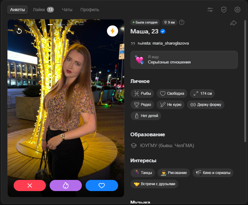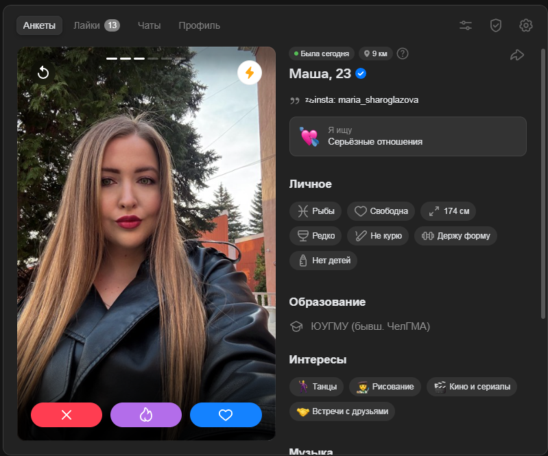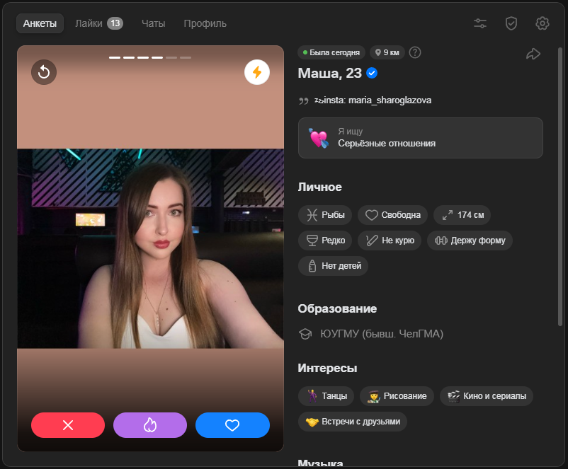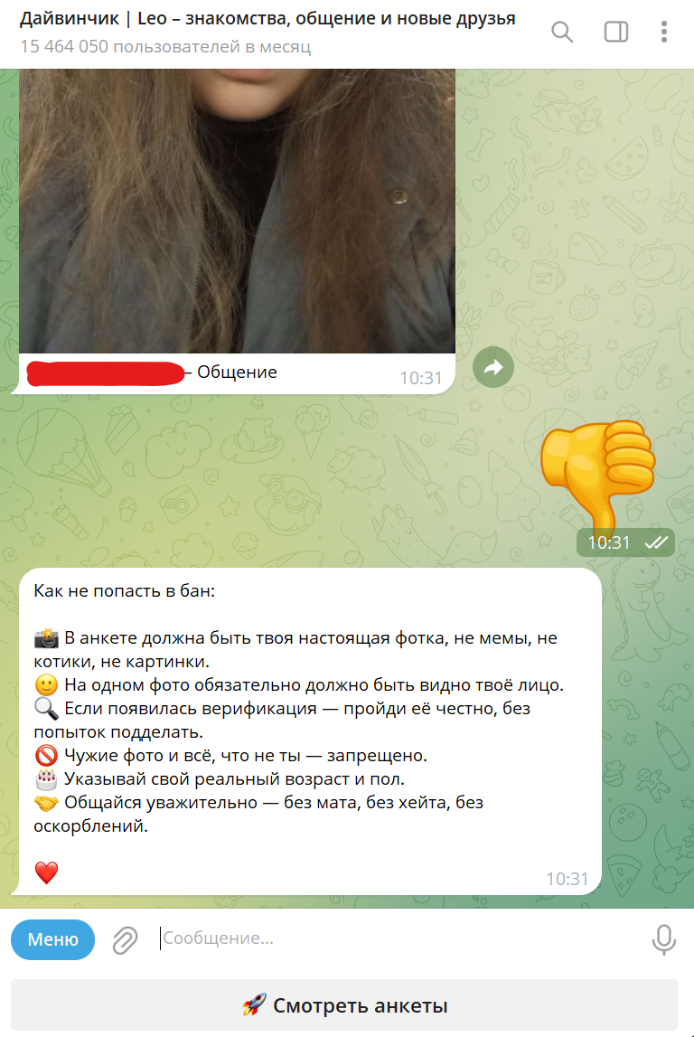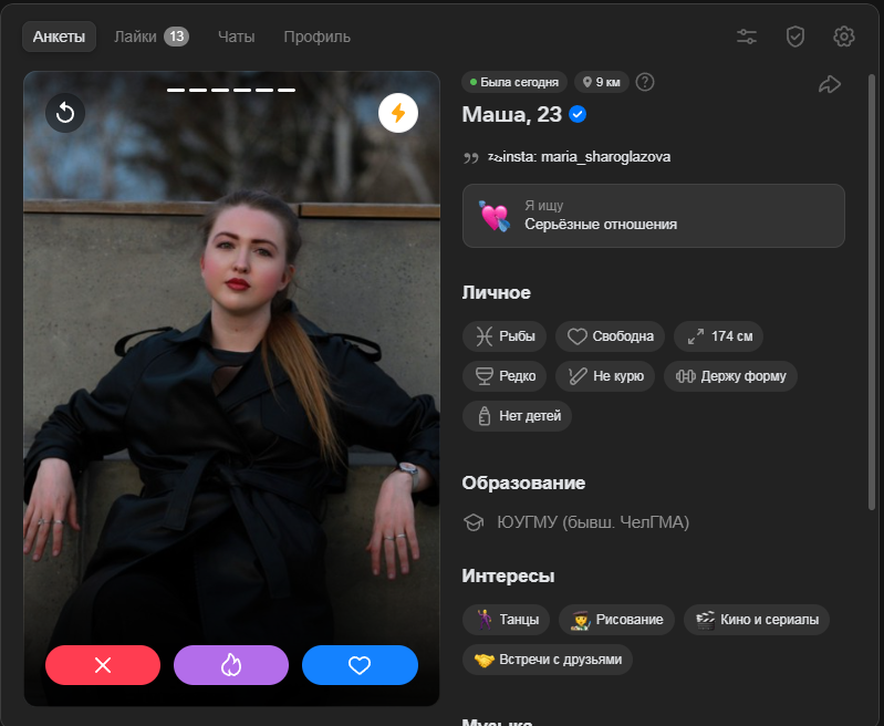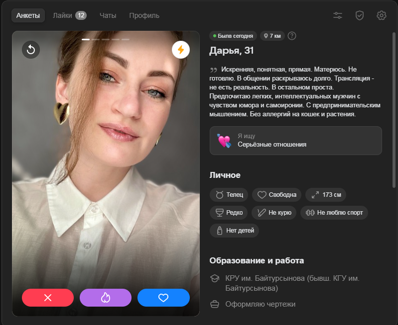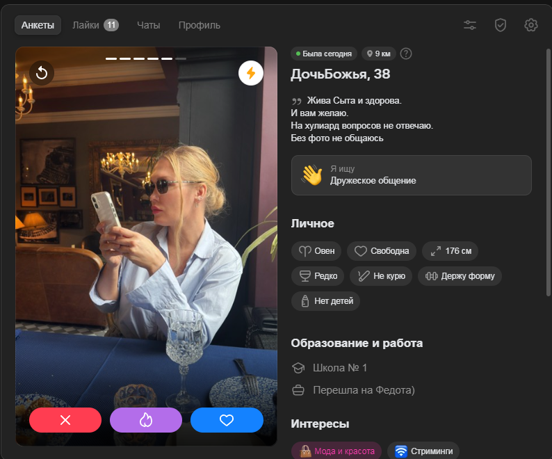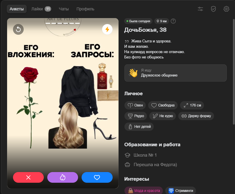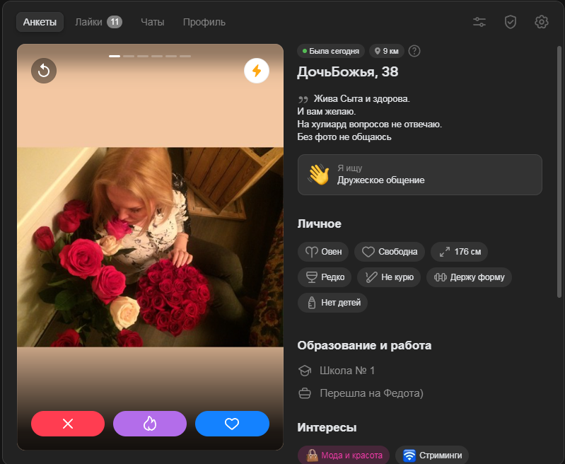 Ну вот, опять с.з макнули меня в говно. Вкатился в дв осенью. Отредачил анкету, залил обычный селфач, вкинул описание и скроллил по приколу в свободное время. Если прямо сидеть и лайкать, прилетали взаимки от неплохих тян 5-6/10. Прилетали рандомные лайки от всратого ужаса, которые тупо игнорил.