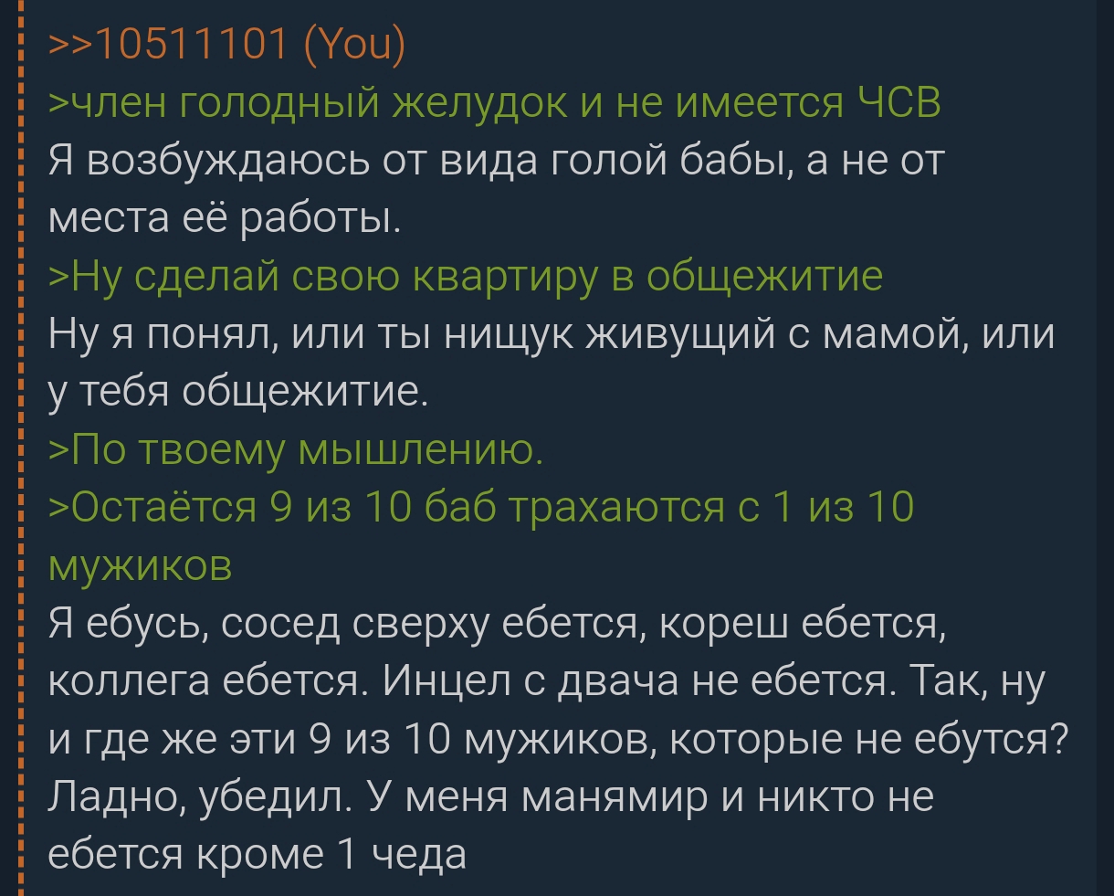 Поскольку здесь периодически пытаются устраивать филиал инцел-треда, к любой полученной ITT информации следует относиться с поправкой на местную аудиторию. Не забывайте репортить инцелошизу и просто шитпостинг (да, это работает). Анал_огично, если видите в треде очередное "я простой парень, сразу зову баб к себе и трахаю по 10 новых баб с СЗ каждый месяц" или что-то в этом духе - погуглите, сколько у среднекуна половых партнеров за всю жизнь, и подумайте, насколько вероятно то, что какой-то pizdobol na dvache набирает ту же стату за месяц-другой.