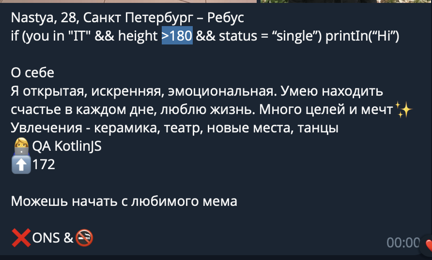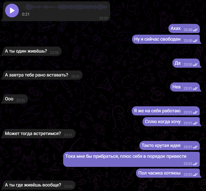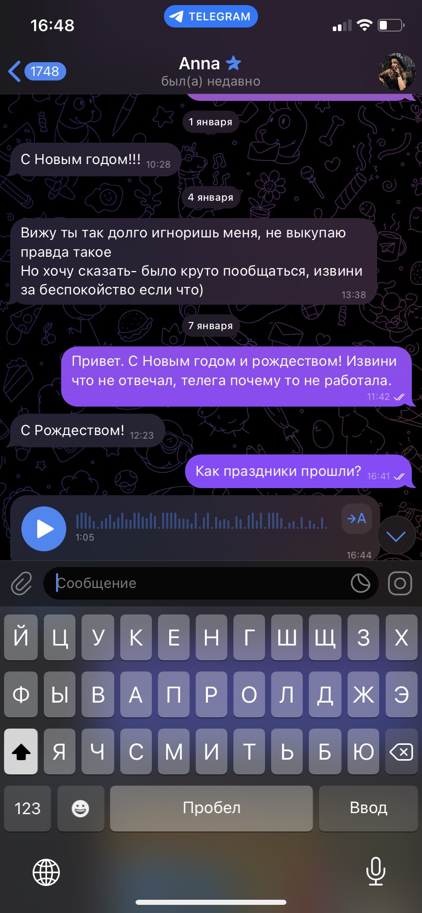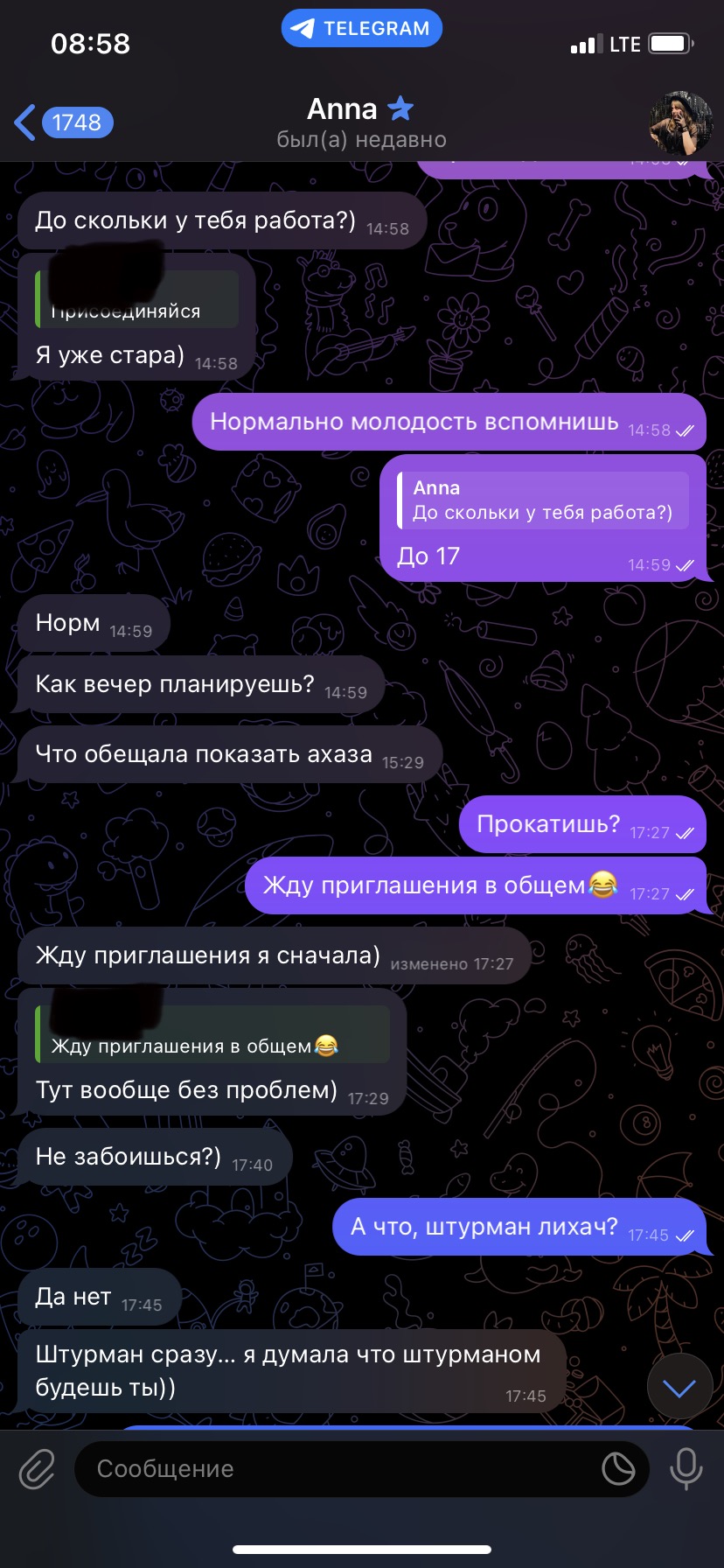 И вот мэтч с милой полторашкой. Отвечает охотно, идёт на контакт. По классике предложил встречу ирл. Согласилась, но перенесли из-за моей загруженности. Сегодня отправил кружок в тг - не отвечает. Может из-за загруженности, а может и нет. В любом случае если не ответит - слив. Потратил больше недели на нёё.