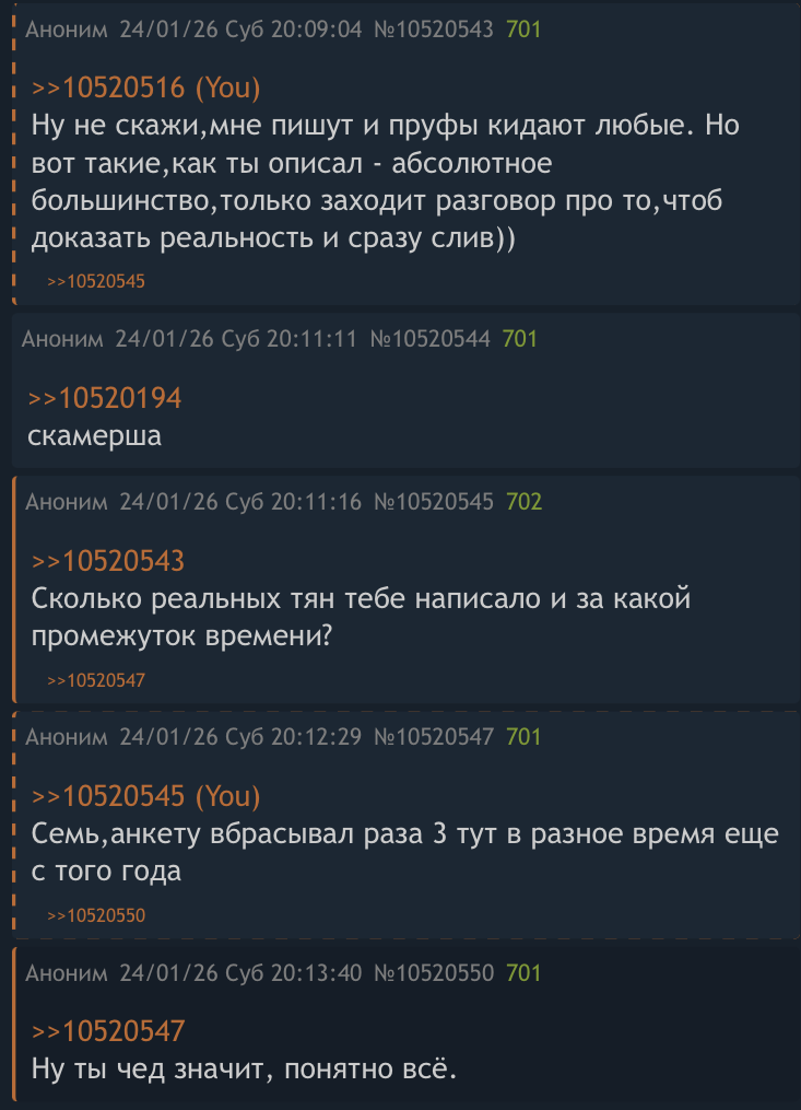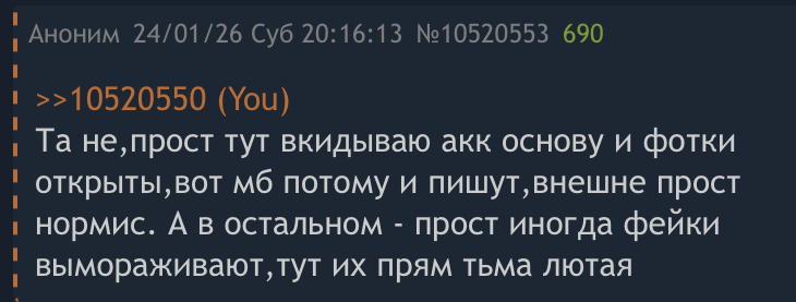 >>10518276 >Это бот был тож так думаю, ну фейк точно, там ещё фотки все на старую нокию в розовых штанах и топике из 90х. Как бы так уже ни одна тян не одевается, тупо наеб. Ну вот такие сз, либо вообще нет отклика либо такие фейки, но даже фейк не проявляет интереса и только отвечает не задавая ни единого вопроса. Тупо даже фейку пох и лениво кек. Но баб да полно прям, такая иллюзия профицита предложения, которого по факту нет.