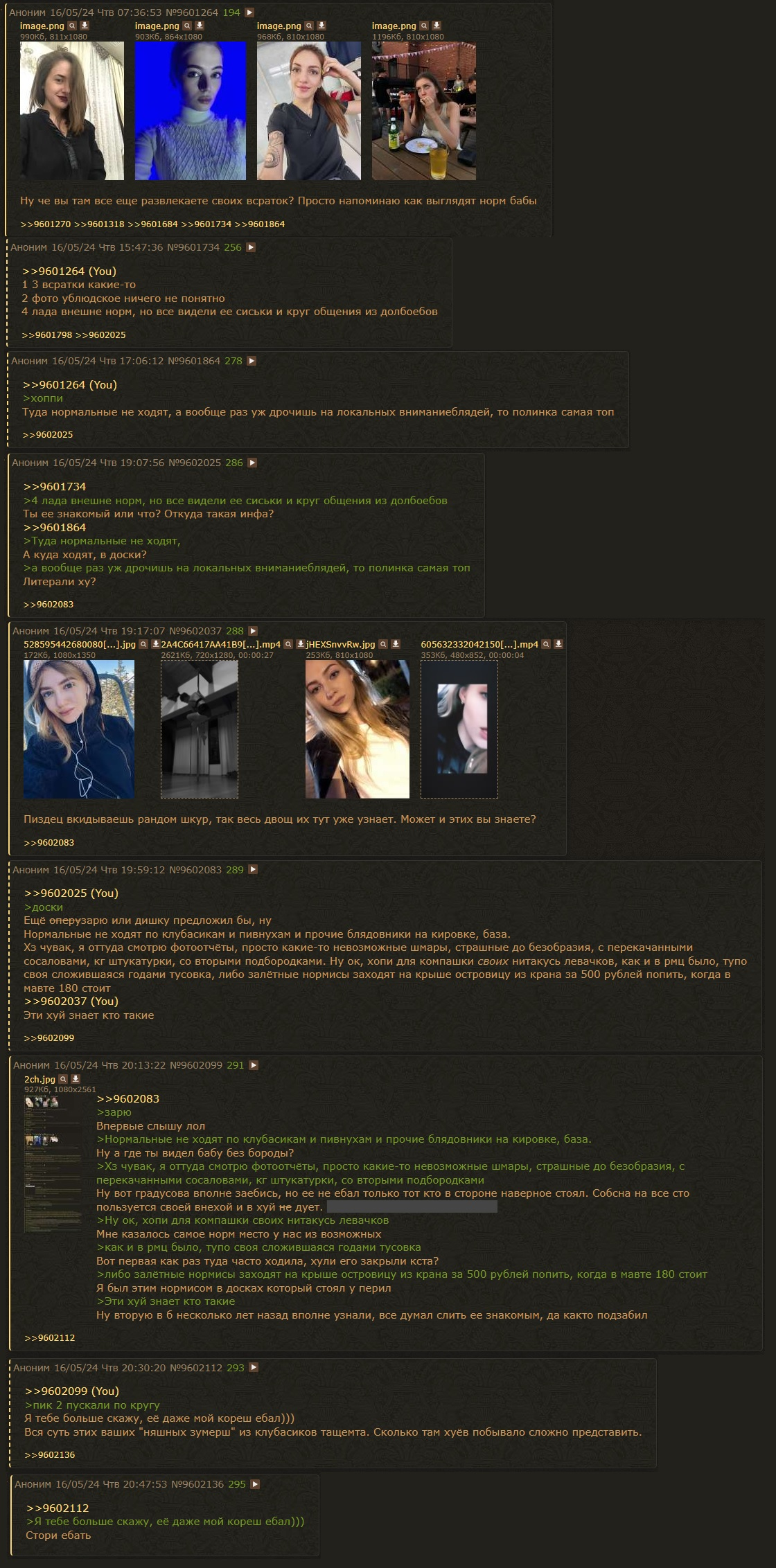 Ой....Ну за 5 лет, в целом. 1. Тян с югов. Адекватная вроде, но расстояние. Не завязалось, хотя просто общались нормально. Был потом проездом в её городе, просто чайку попили в кафе и всё, но у неё уже был кун к тому времени. 2. Психически нестабильная шкура. Прообщались 2 недели, кидала нюдсы, потом она приехала ко мне, я её трахнул спустя 20 минут как встретил вживую в тачке, и потом 3 дня не вылезали из кровати, тусили у меня. Потом она стала странно себя вести, устраивать какие-то истерики и сказала что ей вообще-то к психиатру нужно, далее съебалась. Больше не общались. 3. Довольно всратноватая жирная кобыла, ну думаю ладно хуй с тобой, погуляли, она нылась на жизнь, разошлись. Не особо зашла. Через 2 дня пишет, что у неё овуляция и хочет ебаться, договорились, я накрыл полянку, привёз к себе, когда пора к делу приступать, начинаю раздевать - визг "ты что делаешь, я не хочу". Окей, вон дверь, остановку найдёшь. Больше не общались. 4. Какая-то смазливая шалава, которая сразу сказала что ебаться будет только за деньги, причём начала прокидывать мол ты мне на телефон скинь, туда сюда. Когда я ей сказал, ну ты приезжай, поебёмся я тут денег дам - сразу начала сливаться. Да и хуй с ней собсна. 5. Симпотная студентка, с которой сходили в кафе и засадил ей потом в машине сразу после него. Ну просто стал её тискать, смотрю а она и не против, задышала. Потом поебались еще неделю, и она начала сливаться, хз что не устроило конечно, может что денег не давал. Просто перестала отвечать и закинула в ЧС везде.