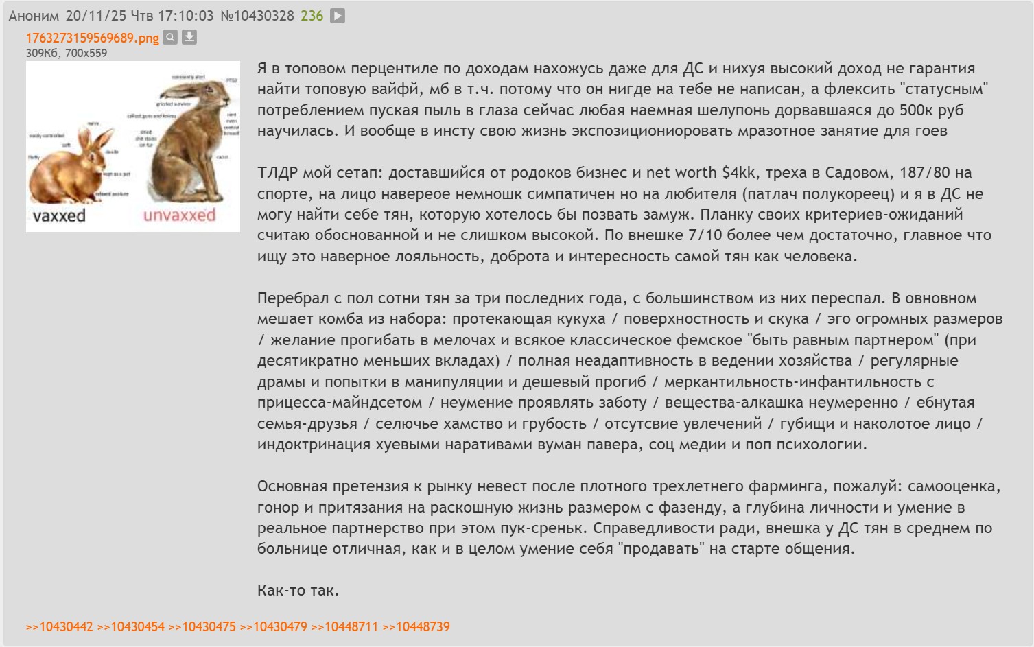 Всё упирается в то, что с текущими раскладами рынка отношача, всячески старающемуся по жизни, но близкому к "середине" парню, живущему в мегаполисе, доступны откровенно хуевые женщины. А чтобы писечный вайф материал тебе достался даже не ОТЛИЧНЫЙ, а просто хороший -- тебе нужно быть ебать каким челом, сильно выше середины нормального распределения.
