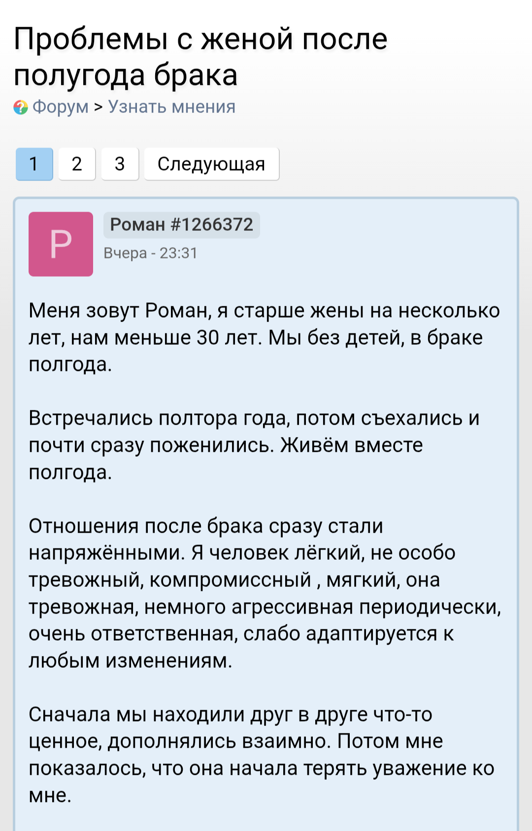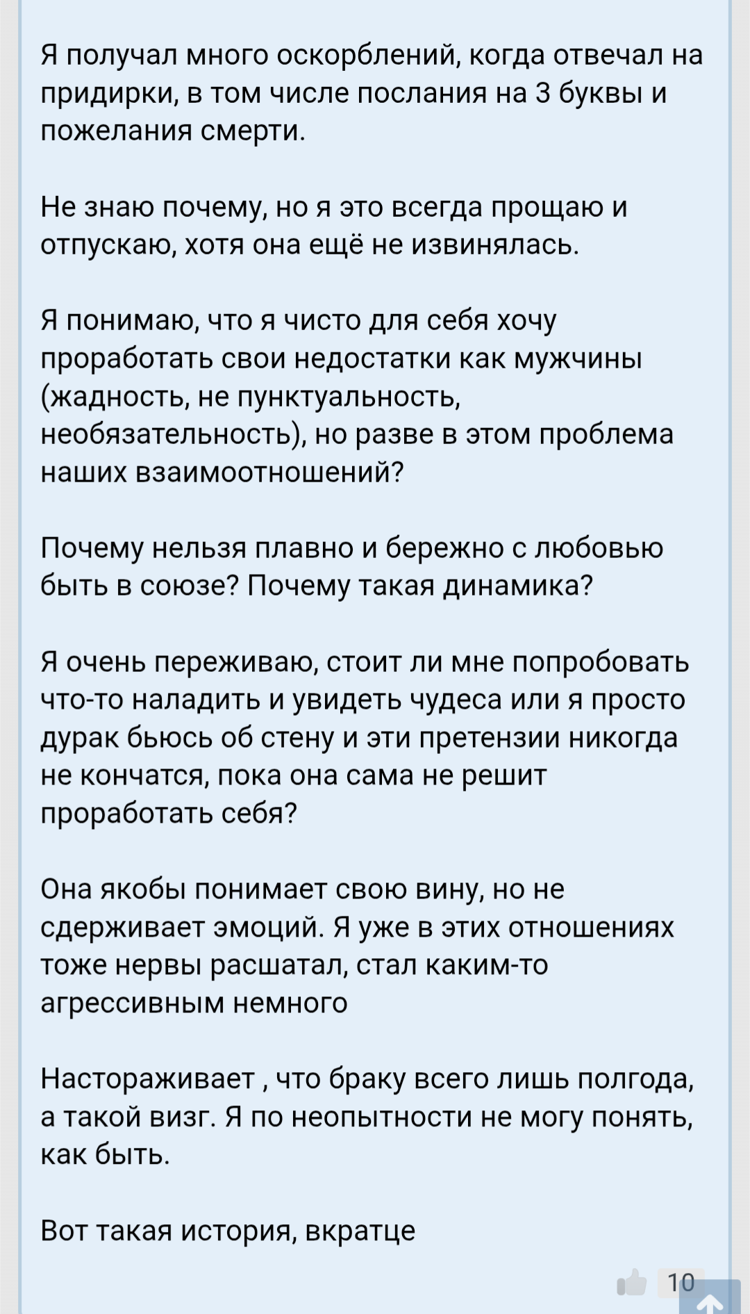 >>10520127 >>10520177 Лох потому что женился не удосужившись даже пожить с человеком на одной территории перед браком. Когда уже до долбоебов дойдёт, что никакие чувства не спасут если не ужились в быту.