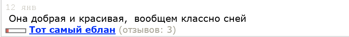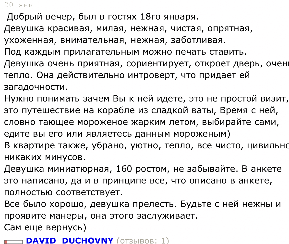 Причём только недавно понял, что это оказывается эта самая, которая уже была года 2 назад с идеальной фигурой, на новой анкете у неё фотки с лицом которое тоже топ, и при этом 8к стоила. Отзывы при этом восторженные, и их дохуя - и очевидно что у неё и тогда, и сейчас огромный поток, но при этом отзывы все восторженные и жалоб на заёбанность нет