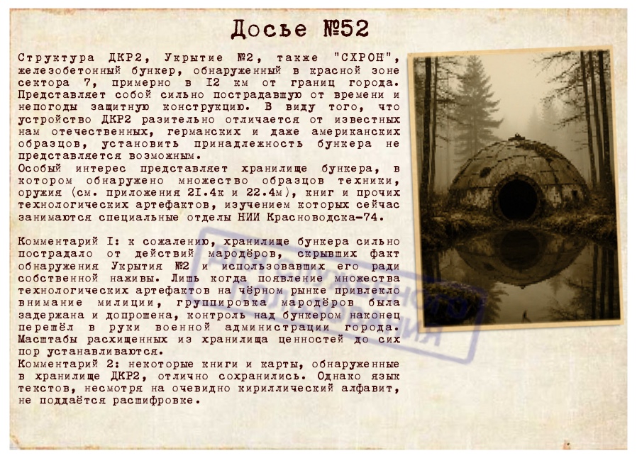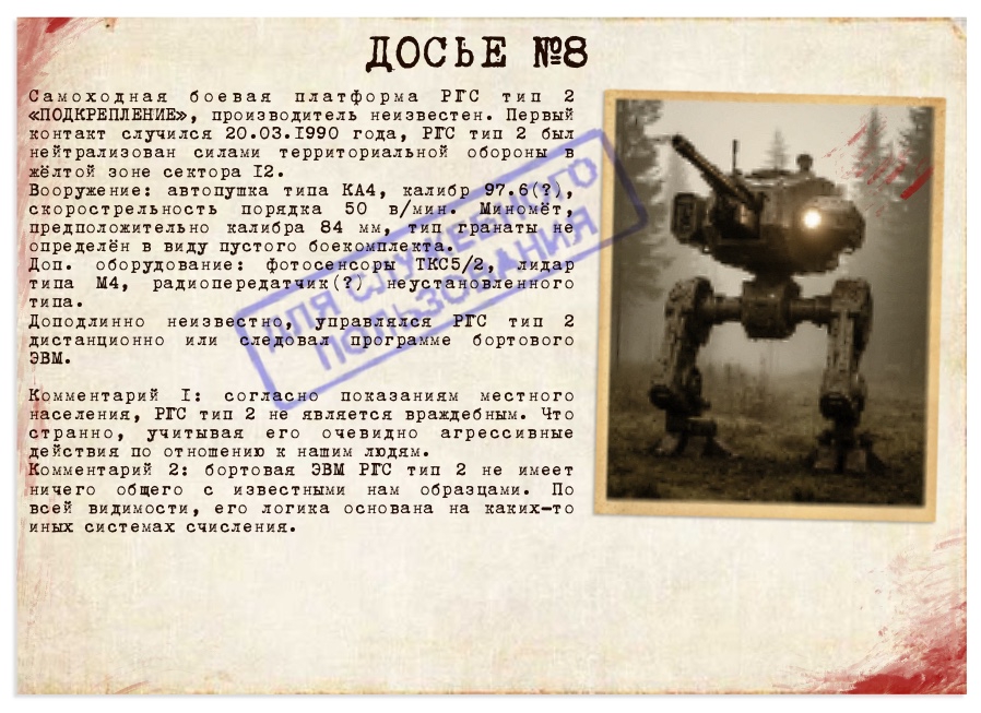 Подкрепление. Боевые, мать вашу, роботы, во время первой стычки принятые за присланное из Норильска подкрепление. Название прижилось. Примитивные, обычно двуногие, крупные дроны. Вооружены простым стрелковым оружием, но калибр нетипичен ни для одной из стран. Несмотря на то, что серийные номера на кириллице, аббревиатуры отсылают к каким-то определённо не существующим в нашей реальности городам и округам. На территорию города не заходят, но атакуют людей, пытающихся проникнуть в лес. Встречаются крайне редко, за всю историю наблюдений не более десятка случаев.