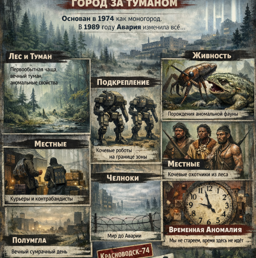 >>261503 >Не раскрыт размер этого и сколько людей в моногороде Средне-крупный городок на севере, население 20-30к. В основном, рабочие и служащие предприятия, плюс всякие соцработники и обслуживающий персонал, плюс военные. Помимо основного предприятия (энергпром и сопутствующие НИИ) — куча мелких мастерских. Т.к город закрыт и находился вдалеке от цивилизации, то изначально должен был быть максимально автономным и обладать большими запасами на случай изоляции.