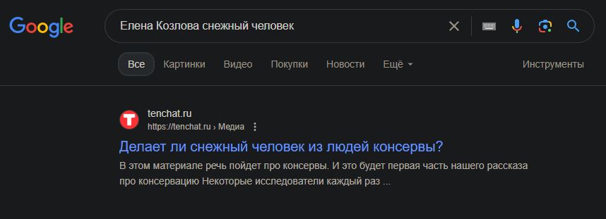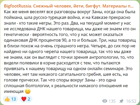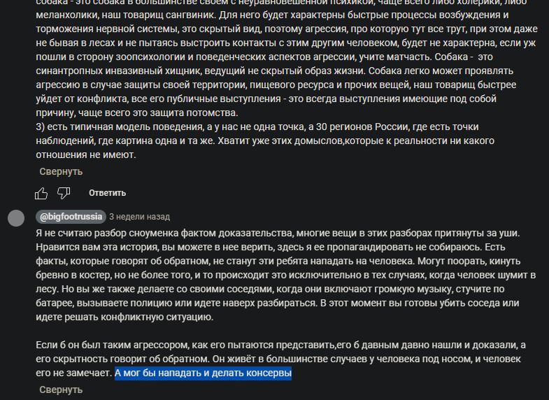 >С одной стороны, в рамках науки, в биологии, биохимии и зоопсихологии сильна, но с другой, исключительно предвзята, типа, "СЧ хааароший" Соглашусь, хоть и мало знаком с её контентом, но из того, что услышал - много научного подхода. Но пердалище моё, конечно, сгорело от того, как она игнорирует, предложенные ей доказательства (речь о фото 17 и фотографии поисковиков), а также от постоянных охуительных историй о консервах (в чём еще раз убедился, введя поисковой запрос), ну и в целом от того, как она свою повестку в виде истины в последней инстанции преподносит (примеры в её ТГ канале).