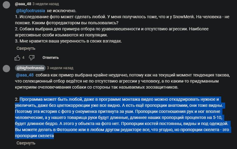 >>822085 Переписывался с одной ебанутой тёткой, ведующей канал на ютубе, которая, якобы, изучает СЧ 15 лет. Говорил ей по поводу этого фото и упомянул фото поисков, где также был запечатлен СЧ, возможно, подросток, наверняка, ты видел его. В ответ получил бан , охуенную пасту, что из-за таких как я появляются истории "про то, что СЧ заготавливает из туристов консервы" (вообще это любимая её паста, вкидывает постоянно), разумеется, на снимке 17 у неё Тибо-Бриньоль, хотя даже если не прибегать к уменьшению экспозиции, а просто увеличить фото, то видны пропорции рта, носа, глаз, видно их расположение, относительно друг друга, нихуя человеческого там нет. Эти и другие вещи она упорно игнорирует и ссылается на консервы. В общем, тётя эта зоошизик от мира гоминидов, уже и такие до темы добрались, увы...