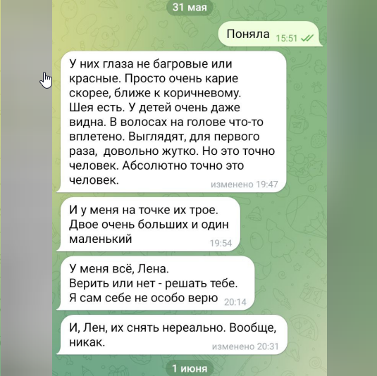 «Мы купили дом и переехали на рудник. Однако в каньоне реки Дир (Буг) машина сломалась, и дальше ехать не было никакой надежды. Я принесла воды и пошла к реке, чтобы заварить чай, а на другом берегу реки медленно шло человекоподобное существо с пышной шерстью на теле.