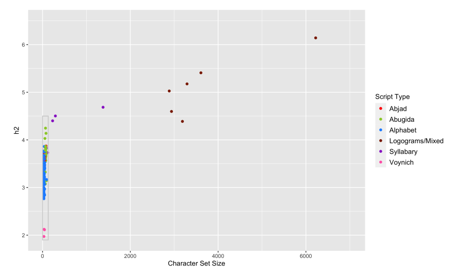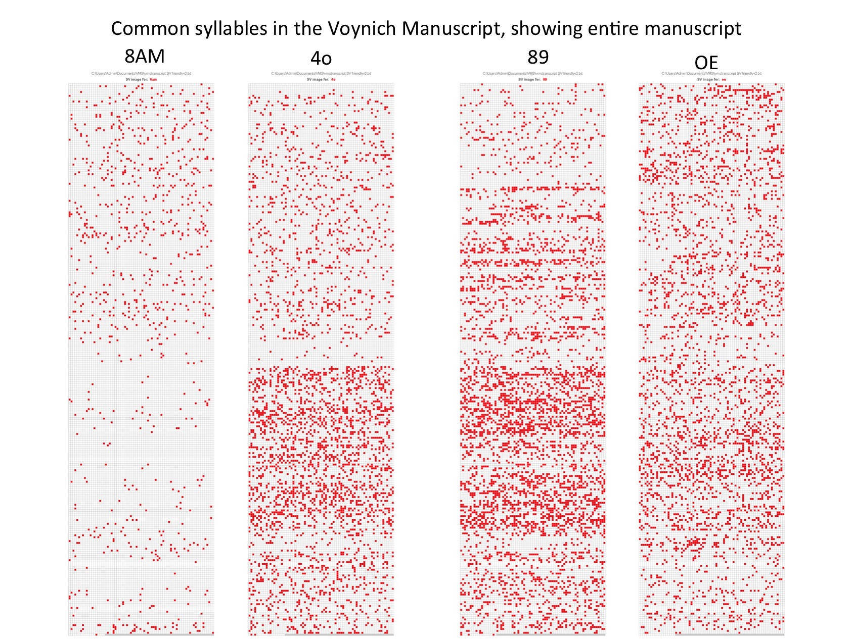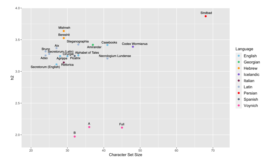 Гримуарчик с неизвестной системой письменности, на неизвестном языке. Вполне вероятно является средневековой мистификацией или мистификацией 19-20ого века от самого Войнича. Больно низкая энтропия биграм для естественного языка, разукрашена небрежно как будто ребенок разукрашивал кисточками эскиз на уроке рисования, разный формат страниц кодекса, расхождение в радиоуглеродной датировке страниц на 100 лет, сильное расхождение в распределении частот "слогов" между "разделами" (в текстах на естественных языках буквы распределены равномернее).