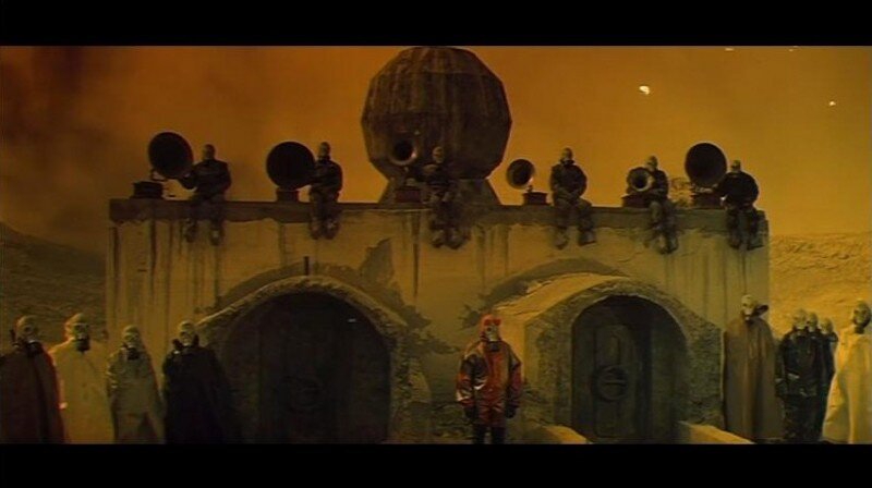 Отдельно вспоминается кадр, где какой-то чувак в то ли скафандре без шлема, то ли в околофутуристичных шмотках (по цвету - светлые скорее всего; сам чувак вроде блондин, но тут могу уже ошибаться из-за давности) лежит на каком-то камне или холме и высматривает что-то вдалеке. Также вдали потом был тот самый биокупол. Точно не помню состояние, может целый, может взорванный или ещё как-то повреждённый.