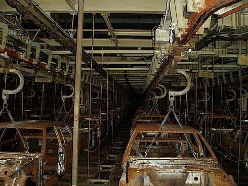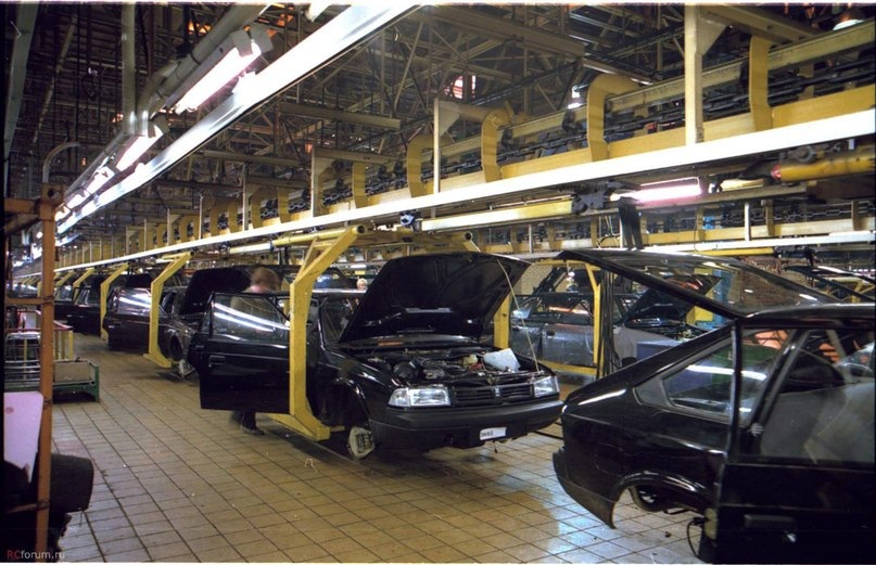 Покумекали немного и пошли, Архипыч в обход, а заодно и мне цех показать. Тут то и начался полный пиздец. Мы прошли по длинным коридорам административного блока и завернули до двух деревянных дверей, ведущих прямо в главный зал. Как же я охуел. Вы никогда не видели таких зданий, клянусь. Ни один из вас даже не представляет себе. Это было похоже на лабиринт из труб, кабелей, конвейеров; это было похоже на огромный самолетный ангар для Боинга, на преисподнюю в форме кромешно чёрного здания, на самое большое и тёмное в мире здание. Только вот оно было еще сука больше, намного больше. И ему не было конца. Но это я понял лишь косвенно, потому что мы вышли в буквальную беспросветную темноту, как если бы младенец решил залезть обратно в утробо матери. Только благодаря освещенному лампами коридору позади нас я смог разглядеть какие-то стеллажи, кабели, металлические ящики и одиноко стоящую тележку для газовых баллонов. Архипыч вдруг нырнул по левую сторону стены админблока прямо в тьму, не включая фонарик. Я пересрал с такого перфоманса и машинально поспешил за ним, и когда мы ушли в абсолютную, ещё раз повторяю и выделяю, ТЕМЕНЬ, всё мое нутро чуть не порвалось от обезумевнего сердца. Я реально тогда начал откладывать кирпичи, и нет, я вовсе не боюсь темноты, но все мы инстинктивно боимся неизвестности. Мы шли по бетону, спотыкаясь и натыкаясь на какие-то железки, проволоки, гайки или камешки, кучки стружки, были даже лужи незастывшего при двадцатипятиградусном морозе неведомого говна. На всякий пожарный я нащупал Архипово плечо и он проворчал "Чё ты как девка!", и его голос разнесся по цеху как рупор, эхо было везде и отражалось от очень далеких стен, отчего я чуть не упал на пол, будто нас собирались расстрелять или сожрать если кто-то услышит. Мы шли долго как мне казалось, и обернувшись я вообще не обнаружил ни единого намёка на свет из коридора. Раздражённым и непонимающим шепотом я спросил куда мы блядь вообще идем, дед промолчал. Вскоре мы остановились и Архип бахнул ладонью по металлу, нащупывая нечто. Я понял что он ищет рубильник, и действительно, после механического треска где-то сильно загудело, мой спутник открыл заслонку щитка и вслепую начал поворачивать тумблеры. Ебаный в рот ребята, как я тогда умирал внутри от невообразимого действа. Весь цех, буквально весь главный зал, тянувшийся настолько невообразимо вдаль, что стояла дымка, замерцал мигающими и трескучими люминисцентками, которых было сотни, тысячи, десятки тысяч. Вы, аноны, наверное не видели огромных зданий, поэтому чтобы вы поняли всю суть этого гигантизма, скажу так – цех километр в длину на триста метров в ширину. На деле 500 на 200. Но суть одна. Оборудование было почти в идеальном состоянии, многое было из нержавейки, что-то уже настрадалось за годы сокращения мощностей. По поводу оборудования пикрил для понимания, ибо это невозможно описать кратко. И мы видели множество автомобилей разной степени сборки, идеальное состояние. Сотни Москвичей, 412-ых особенно много. Мы обошли быстренько главный зал, ничего не рассматривая и не трогая, не задерживаясь на месте, не входя в смежные залы и встроенные помещения, не опускаясь подпол (да, там был неебически огромный подвал для отвода отходов аля техмасло и коммуникаций), не поднимаясь выше. Архип только лишь показал мне центральные и рез