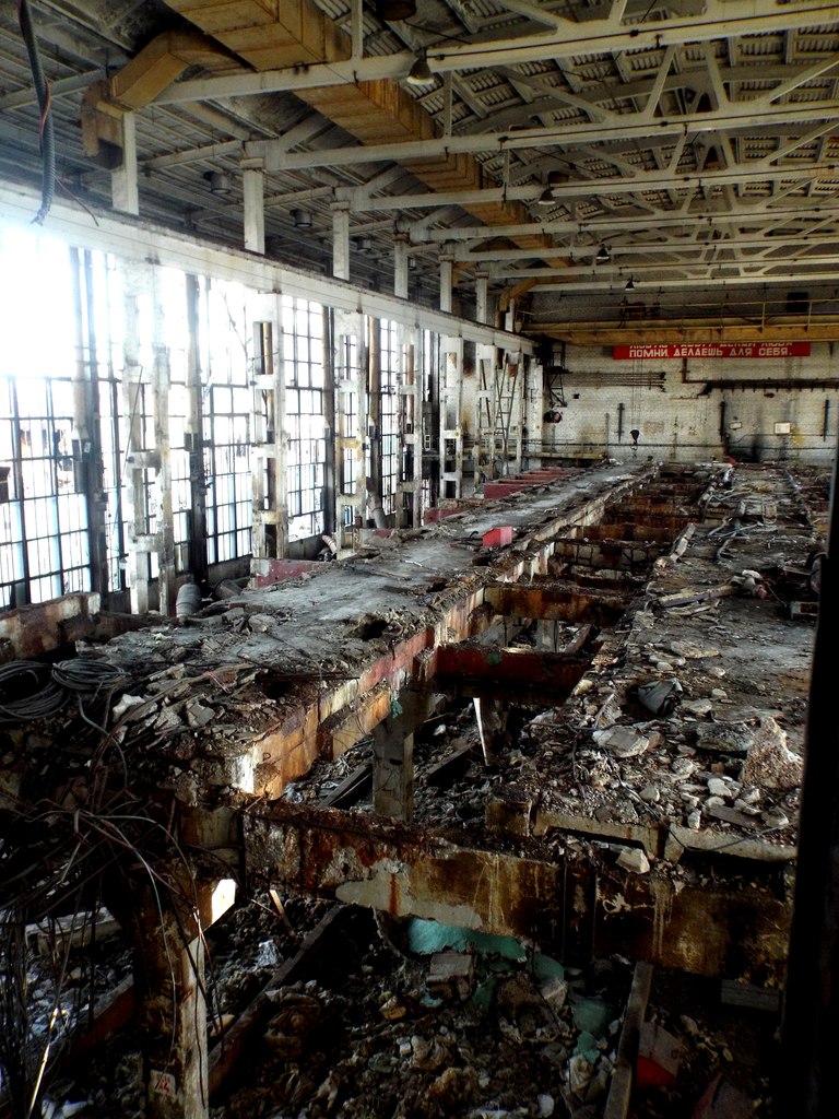 А ведь это настоящий ужас, когда осознаешь, что на этом заводе люди стремились к каким-то своим целям, имели семью, работу, коллектив, а потом постепенно всё вымерло, и лишь пустые залы, и голые кирпичные стены, остались, чтобы хранить эту тень прошлого...