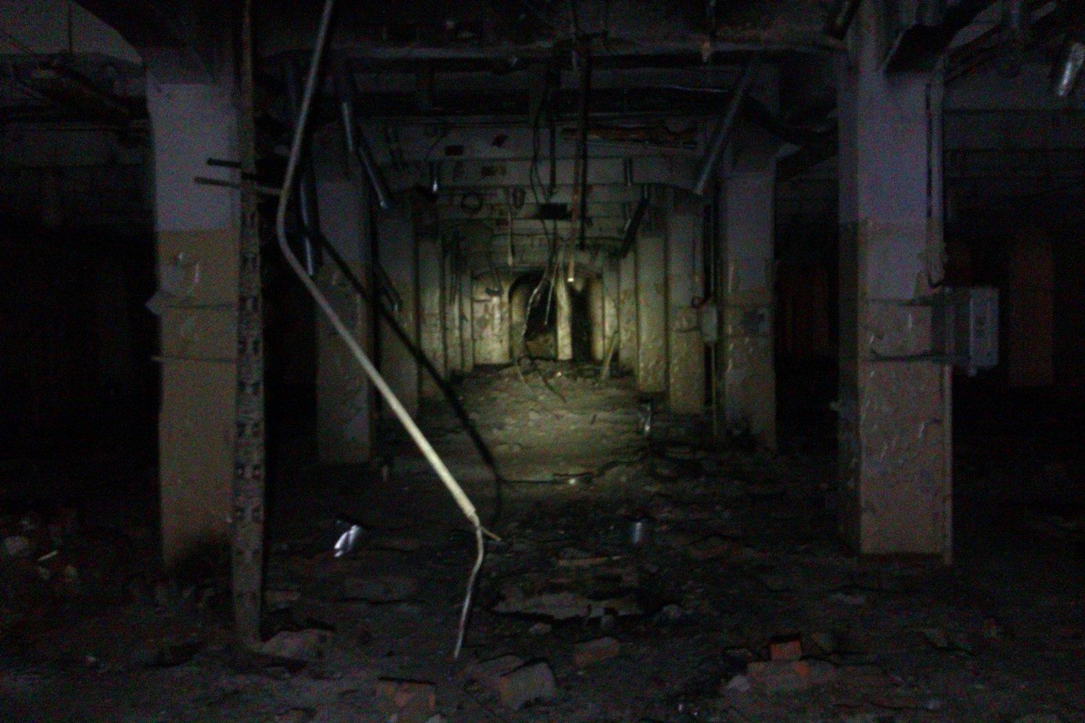 Стараясь не шуметь я аккуратно спустился по лестнице на один пролёт к своему удивлению я не увидел каких-либо проходов в стороны, а лестница уходила лишь ещё ниже. В итоге спустившись на 3 или 4 пролёта я попал в длинный коридор, скорее даже туннель, слабо подсвеченный трещащими советскими флуоресцентными лампами.