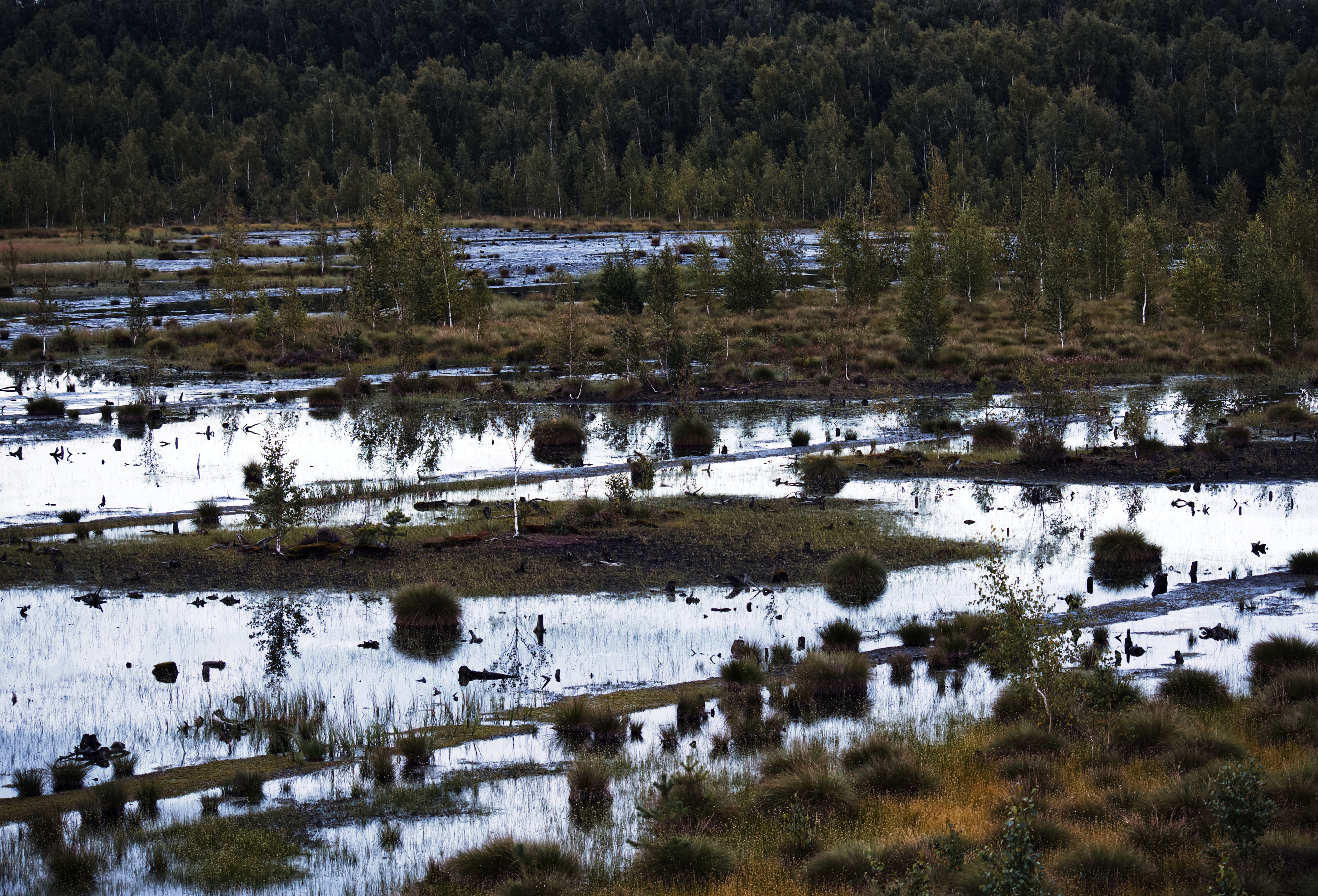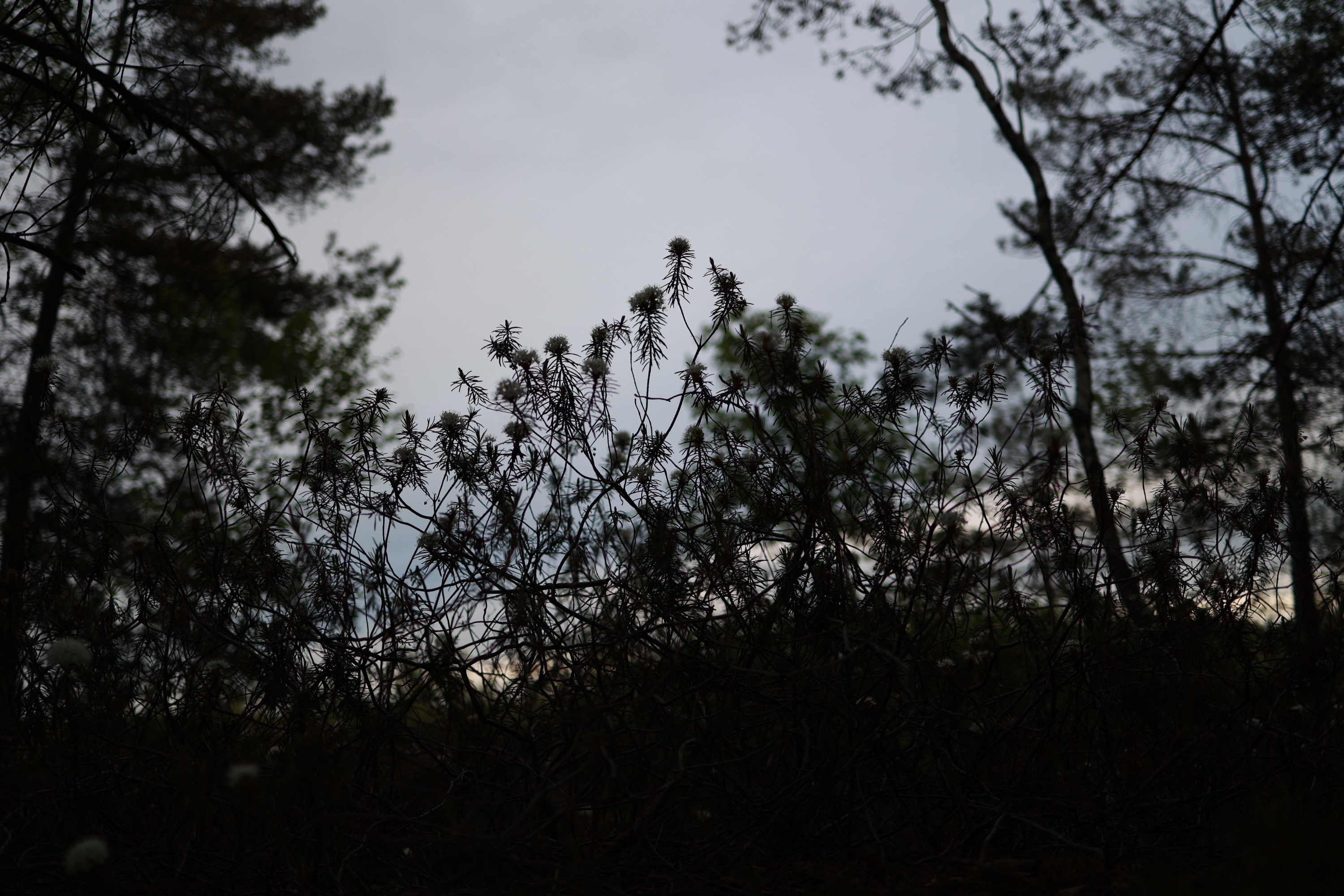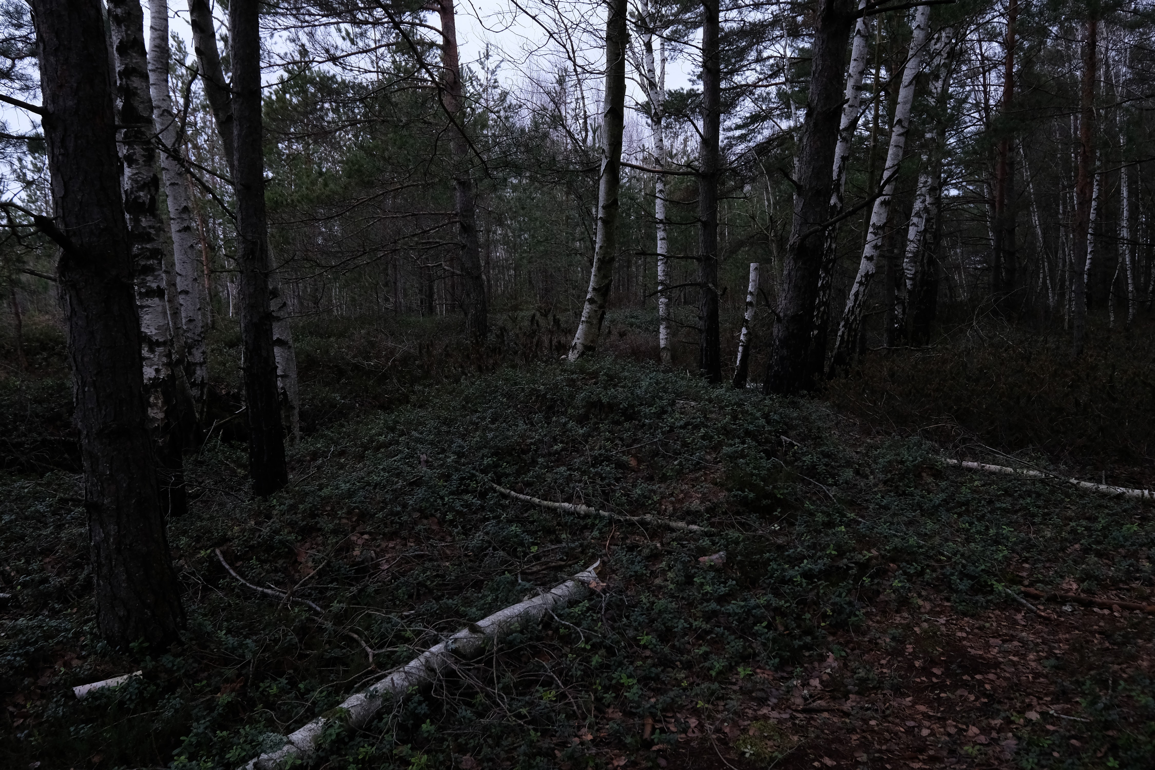 Выхожу к более "свежей" разработке торфяной - она не поросла мелким лесом как та по которой я путешествовал, а просто представляет собой топь поросшую молодыми деревцами и травами. Начинает темнеть. Впереди снова лесок, ныряю туда - и офигеваю с того как камера щелкает затвором медленно - там почему-то пиздец темень, хотя сумерки пока только начинаются. Снова покореженные деревья, и вот оно - следы механизмов.