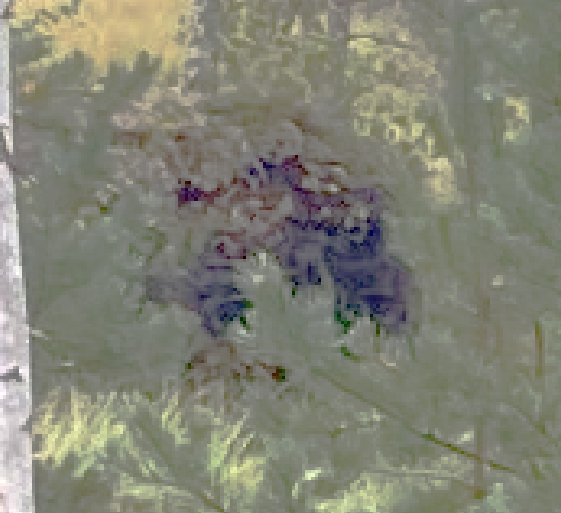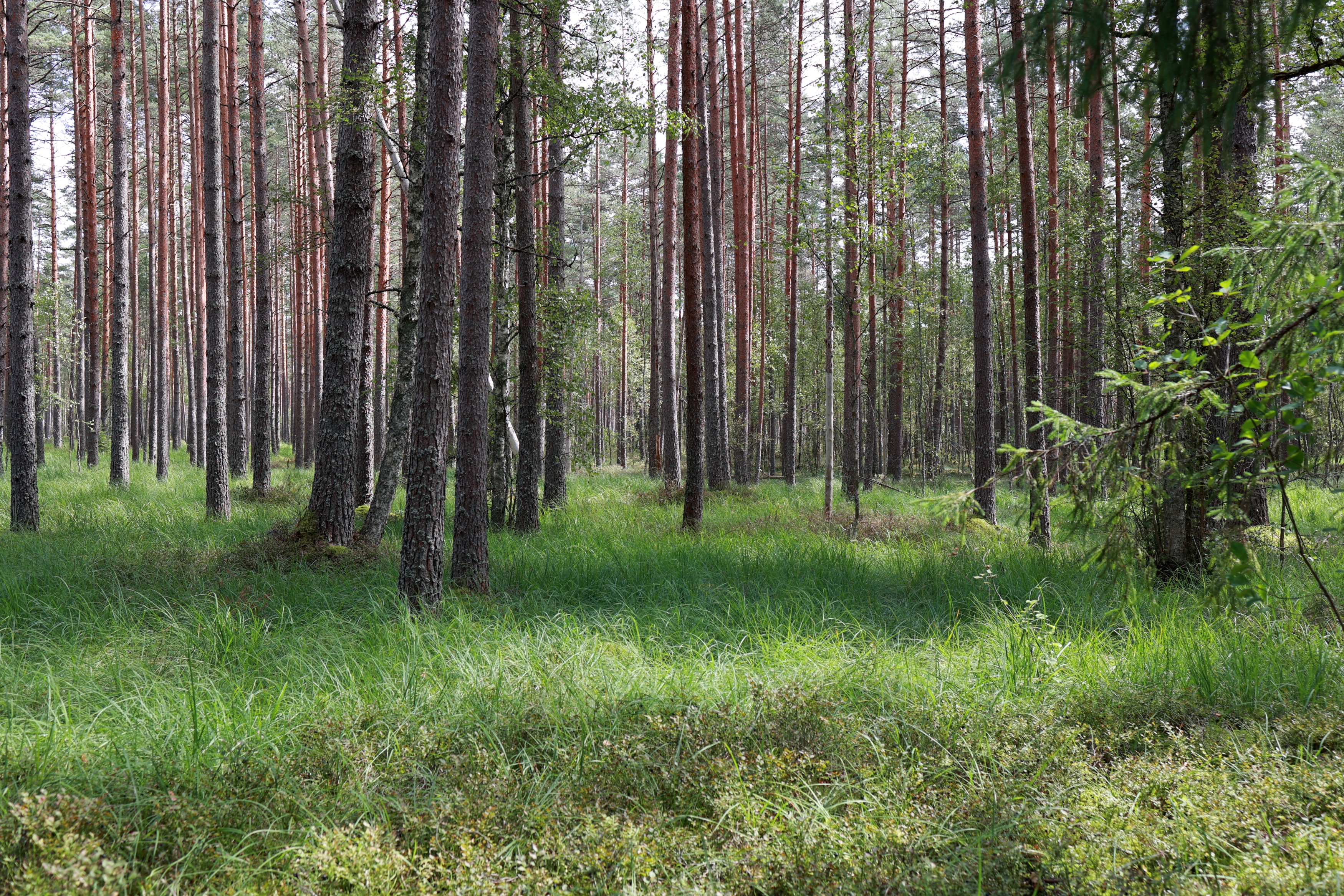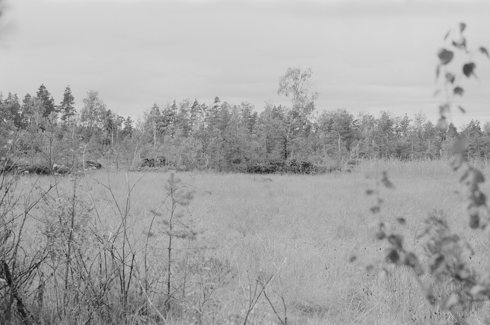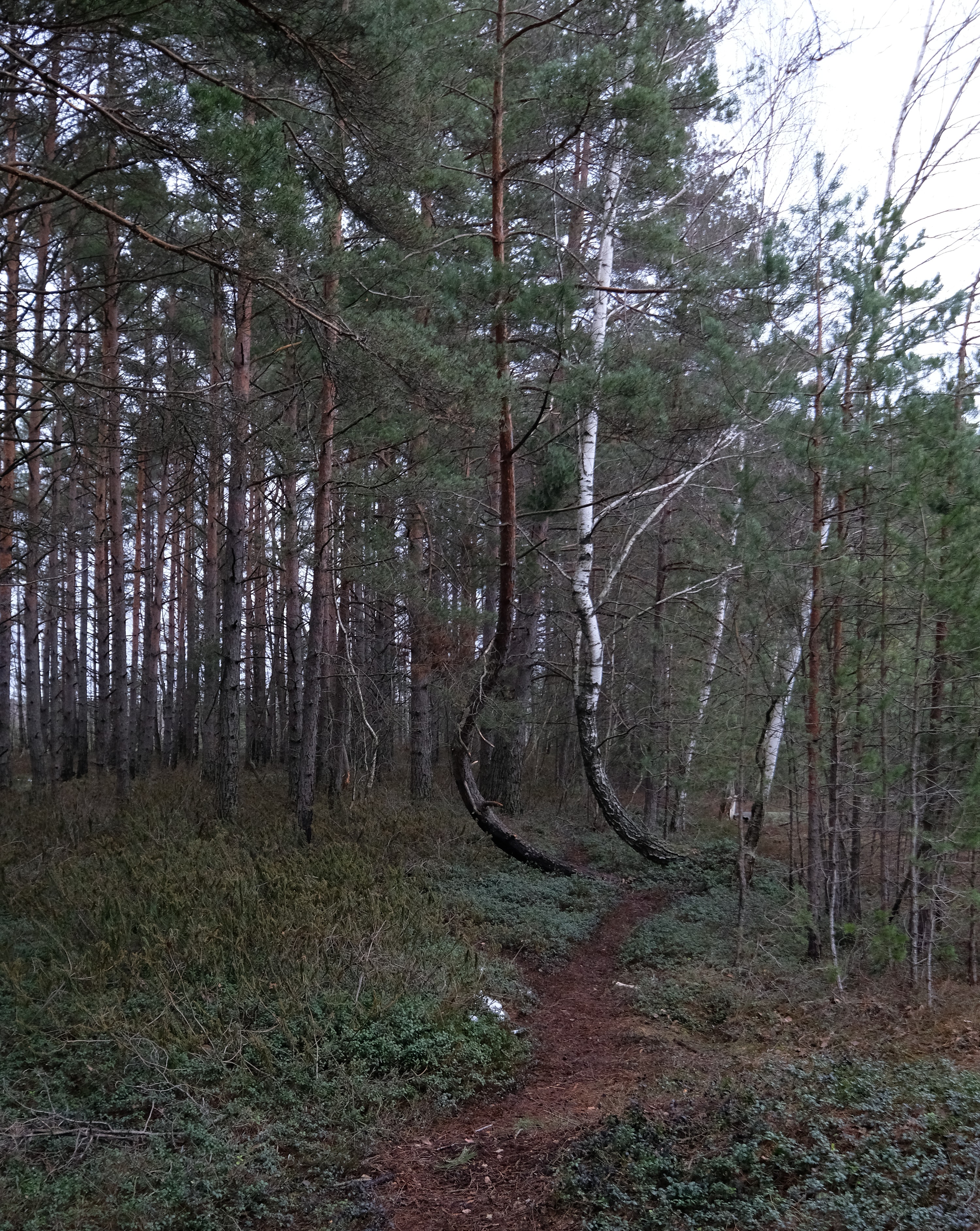 Выхожу к более "свежей" разработке торфяной - она не поросла мелким лесом как та по которой я путешествовал, а просто представляет собой топь поросшую молодыми деревцами и травами. Начинает темнеть. Впереди снова лесок, ныряю туда - и офигеваю с того как камера щелкает затвором медленно - там почему-то пиздец темень, хотя сумерки пока только начинаются. Снова покореженные деревья, и вот оно - следы механизмов.