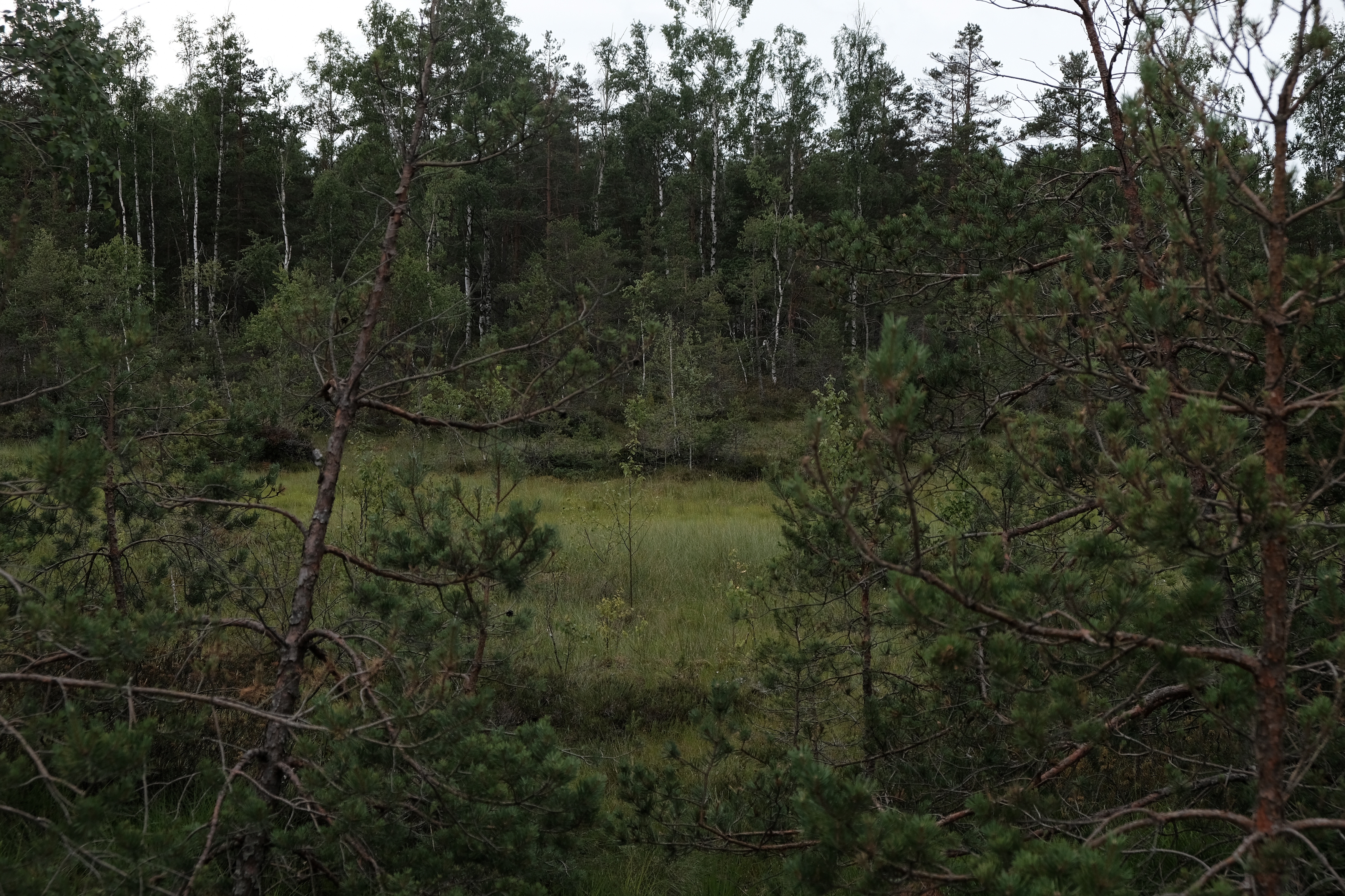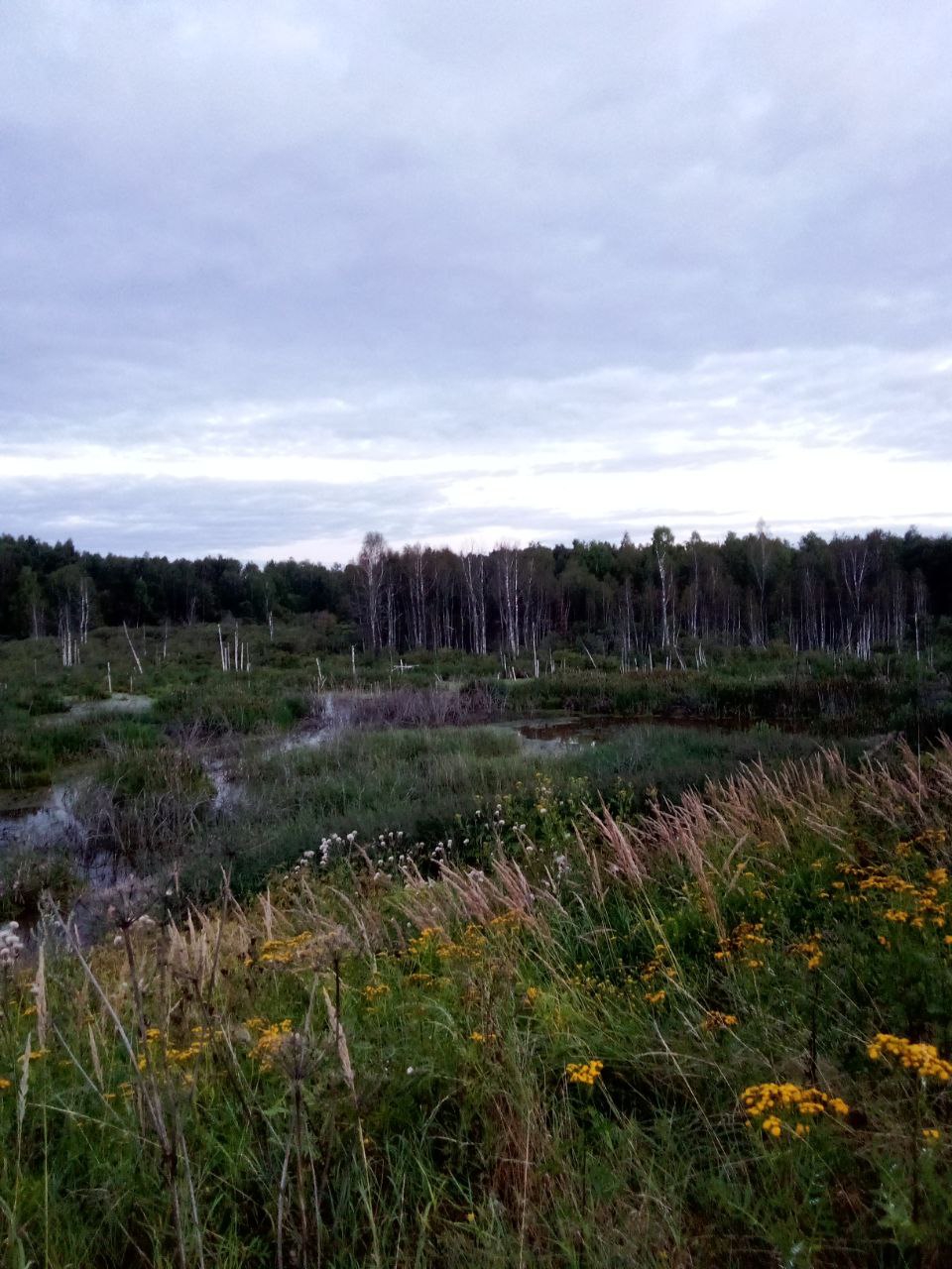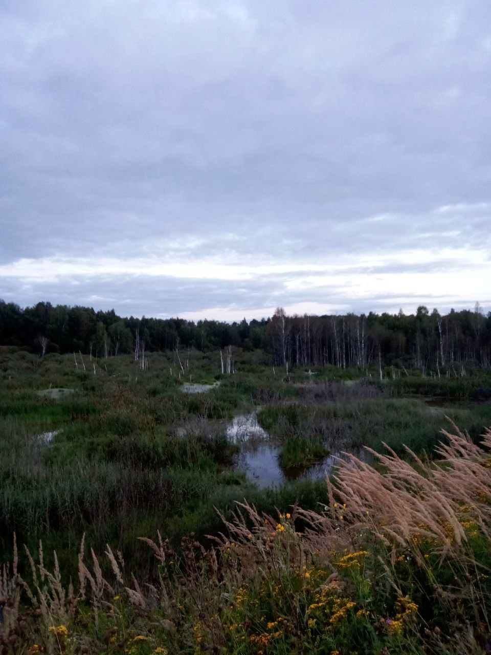 Фотка оттуда, уже когда обратно шел. Современные телефоны неплохо так вытягивают в легких сумерках картинку, должен сказать. Но совсем не до фото было, потому что промок и изговнил одежду уже за первые 10 минут, плюс темнело и дождь мог снова начаться, реально разрыв смог в 2 часа поймать между дождями и очень торопился. Голос кстати скорее всего кто-то у поселка на краю болот самых смотрел что-то или слушал, благо колонки дешевые и долбящие доступны всем, тут мистики нет, но нагнетало сука.