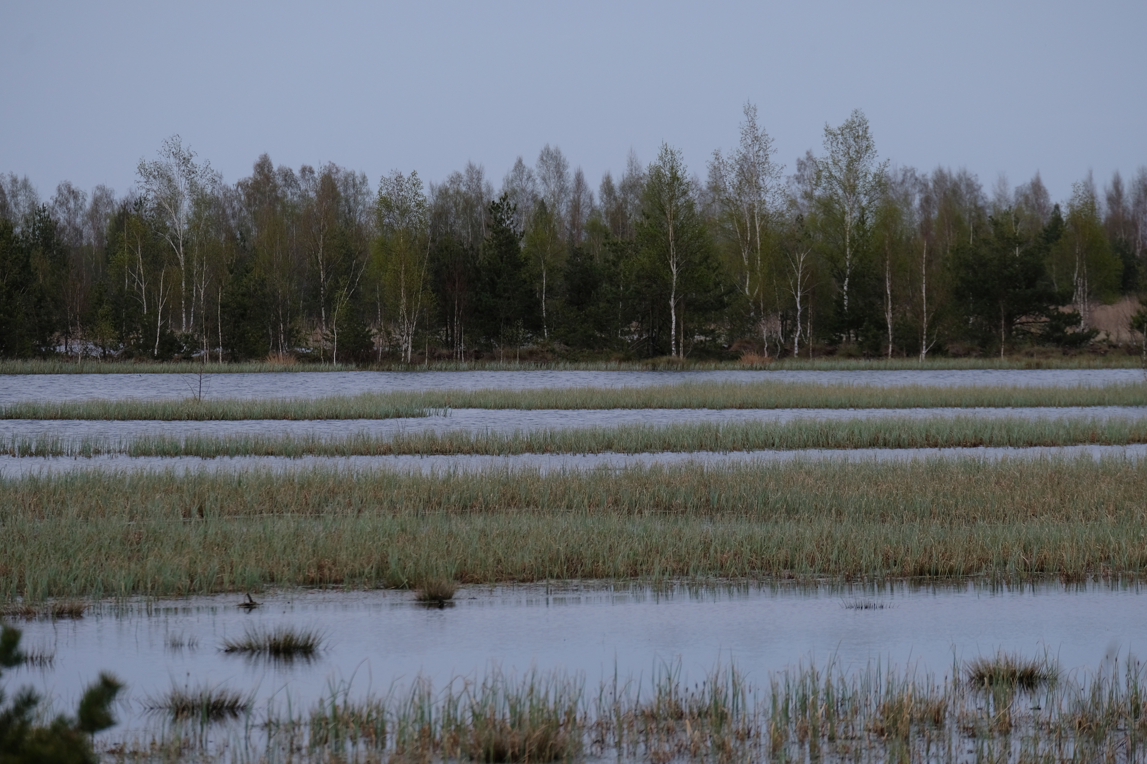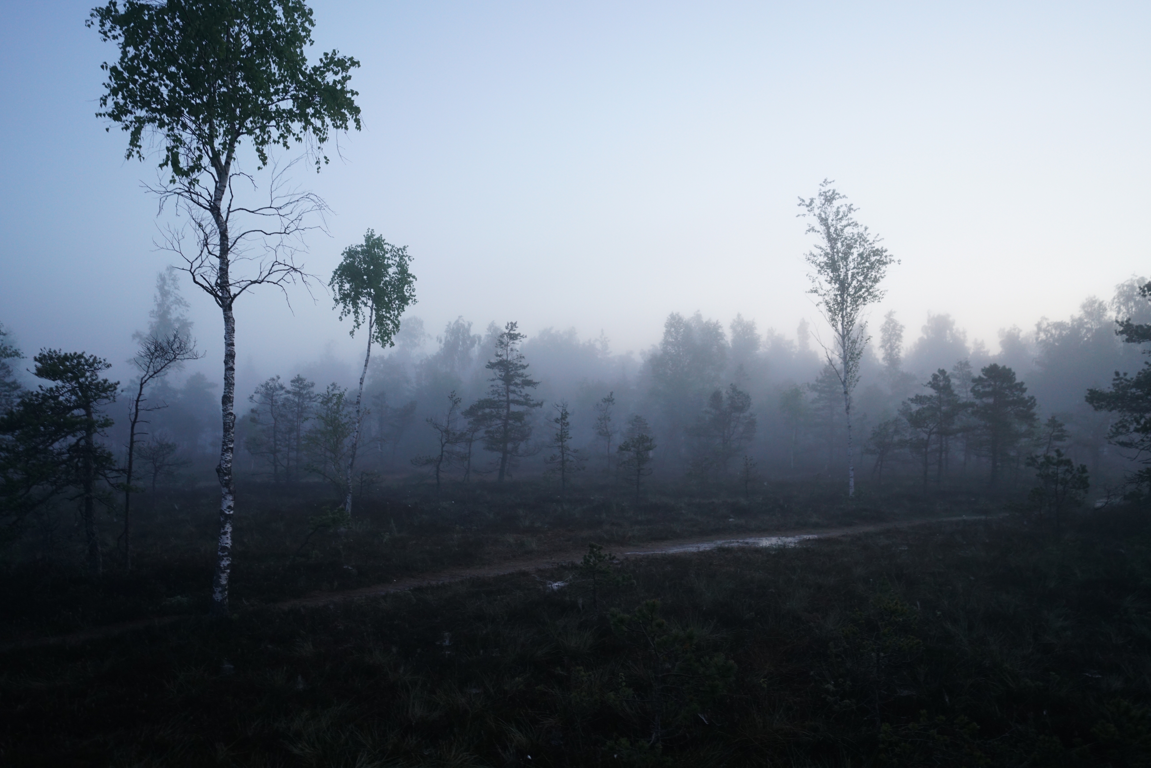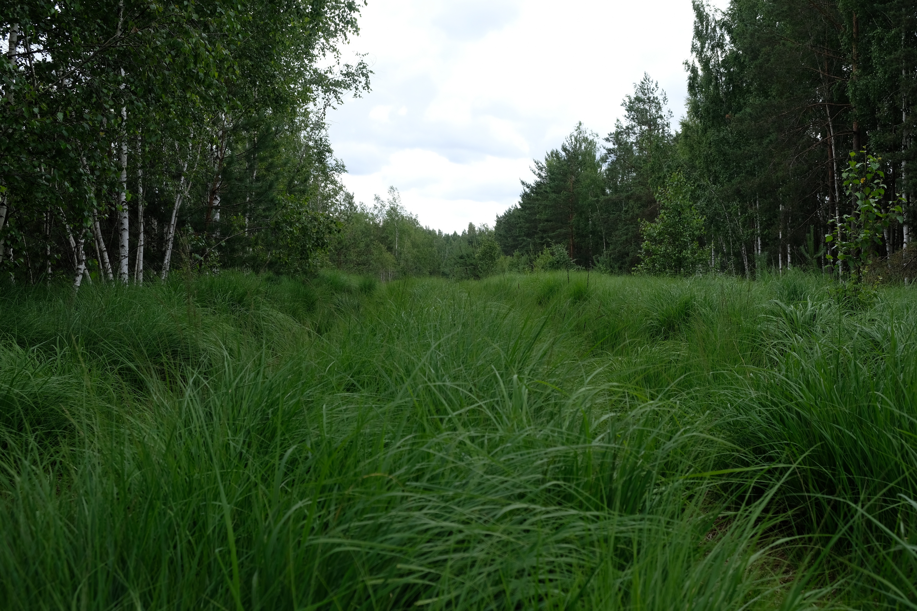 Фотка оттуда, уже когда обратно шел. Современные телефоны неплохо так вытягивают в легких сумерках картинку, должен сказать. Но совсем не до фото было, потому что промок и изговнил одежду уже за первые 10 минут, плюс темнело и дождь мог снова начаться, реально разрыв смог в 2 часа поймать между дождями и очень торопился. Голос кстати скорее всего кто-то у поселка на краю болот самых смотрел что-то или слушал, благо колонки дешевые и долбящие доступны всем, тут мистики нет, но нагнетало сука.
