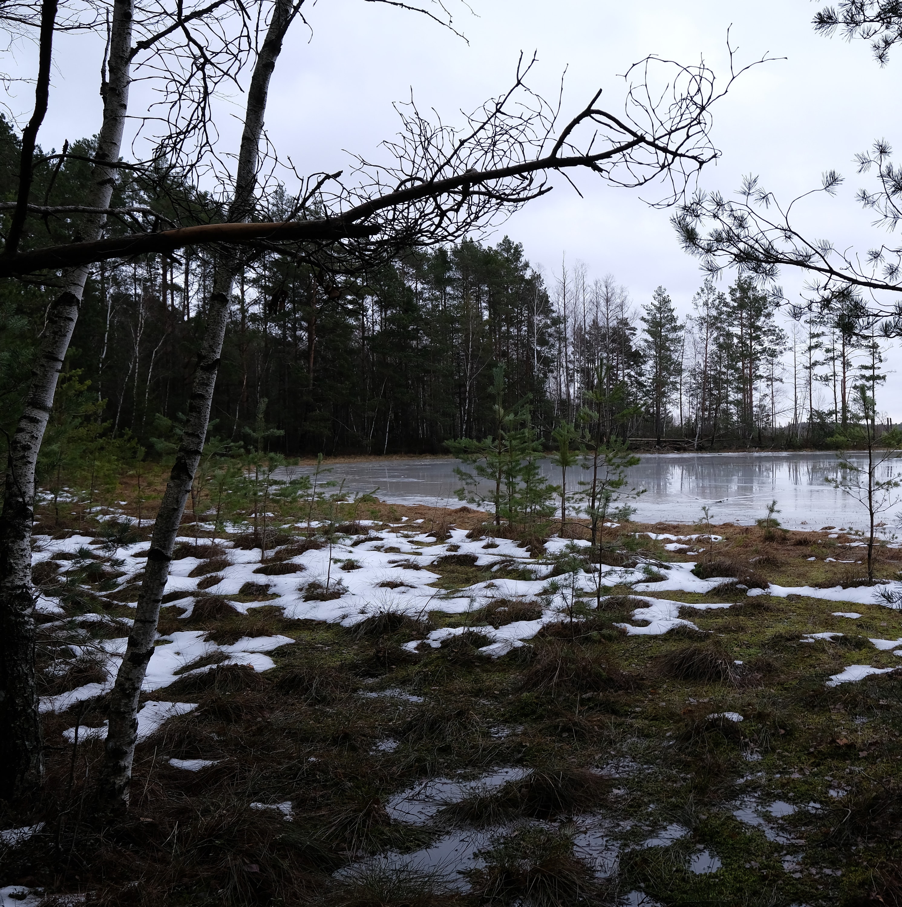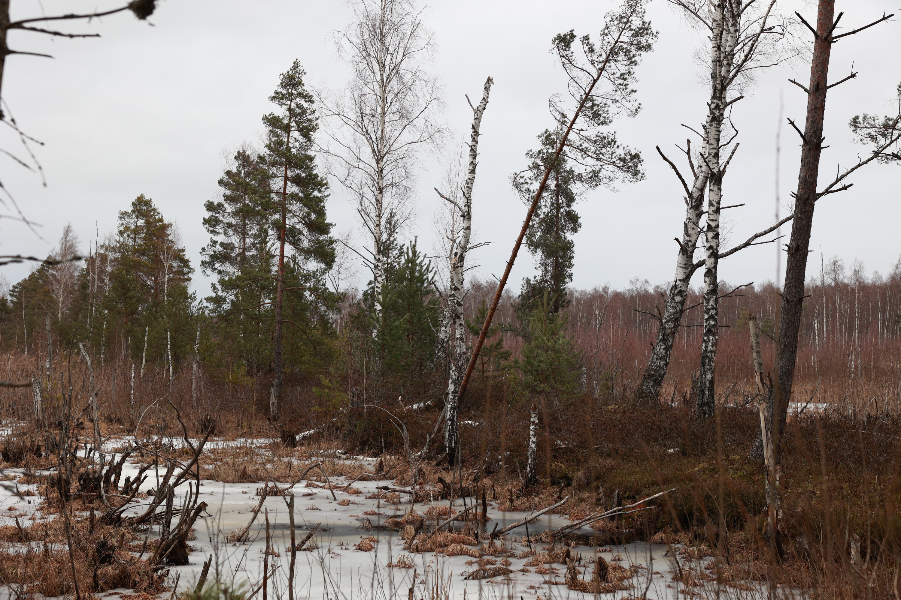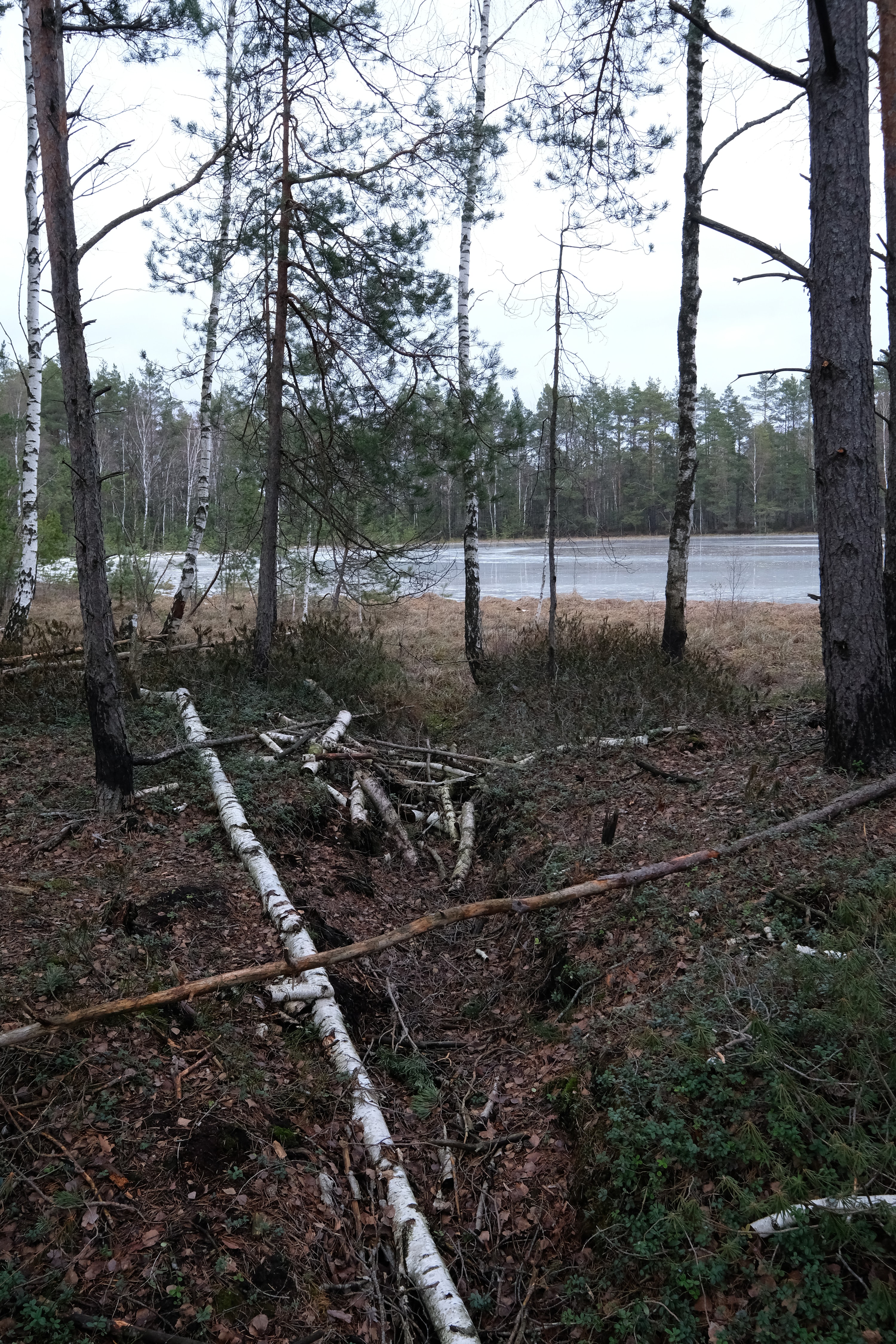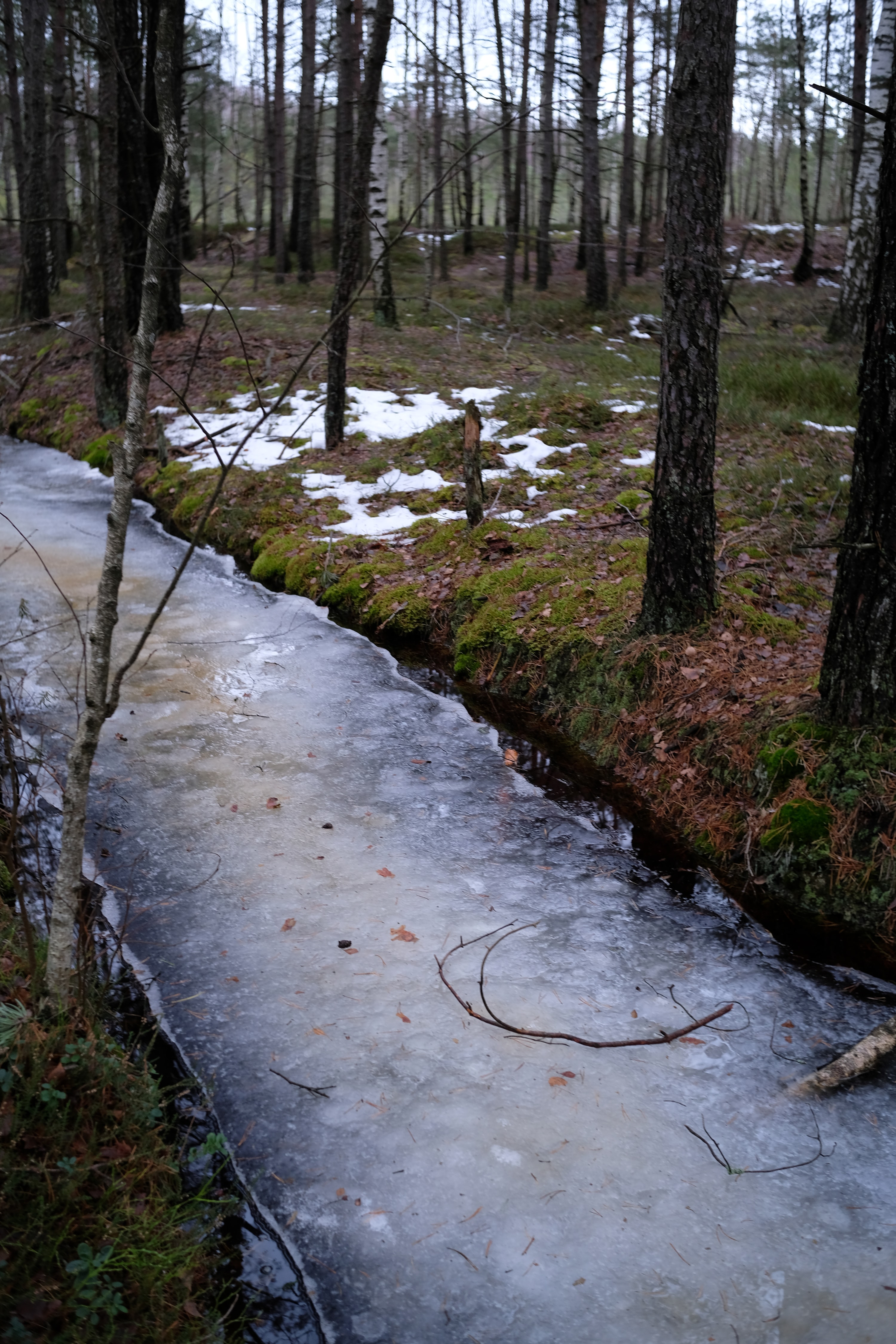 Несколько километров ползем по лесу который превращается в болото, то скользя по льду то выдирая берцы из чавкающей грязи, и дивимся на старые мелиорационные канавы - часть залита водицей доверху, часть наполовину, часть вообще сухая