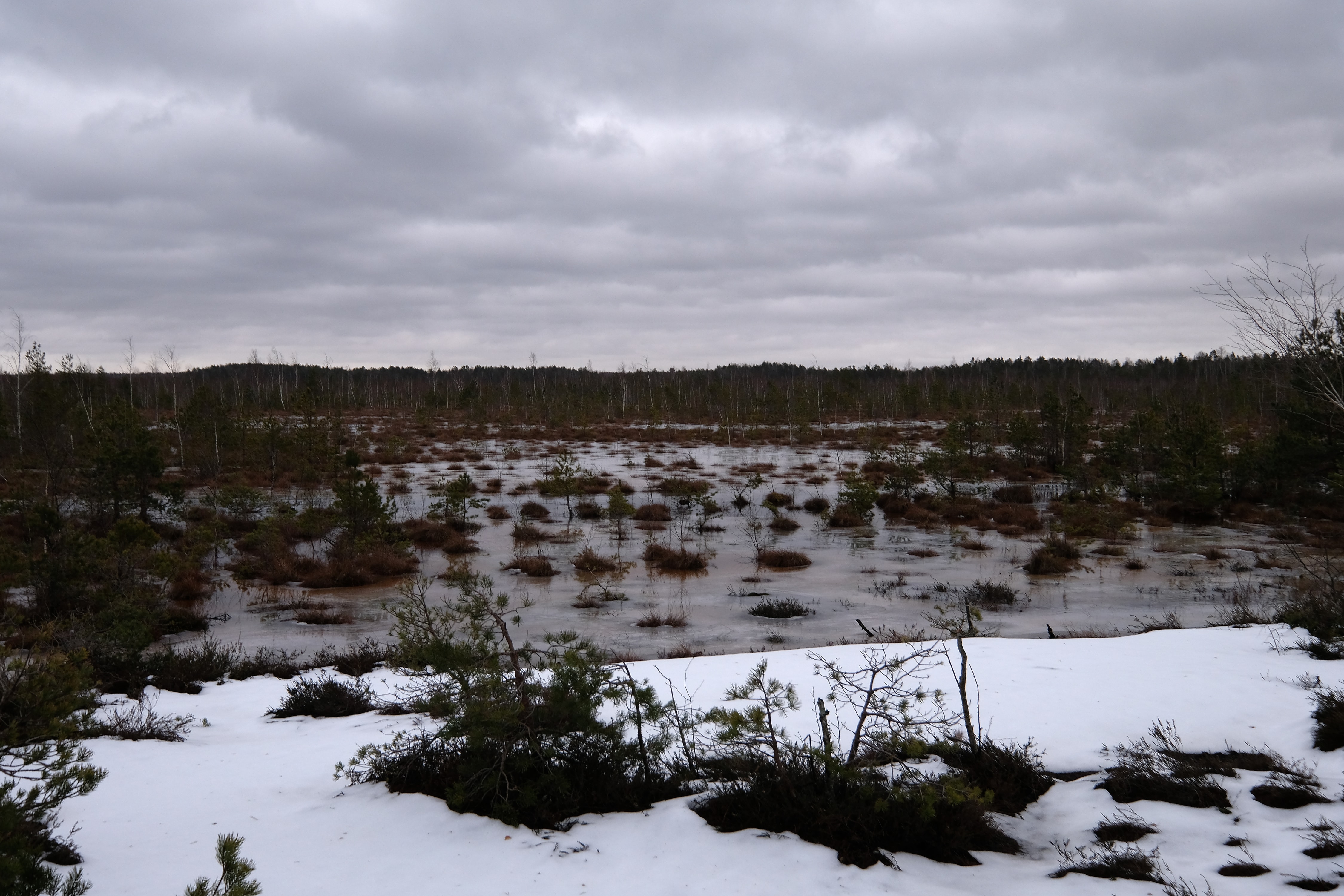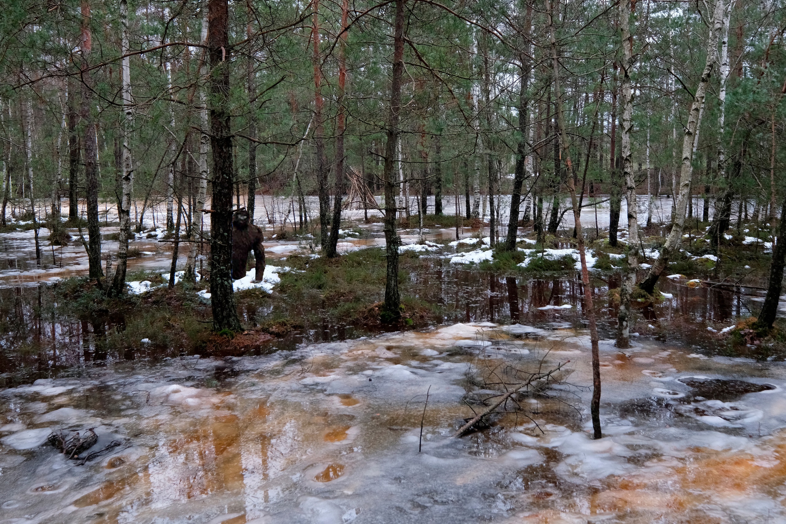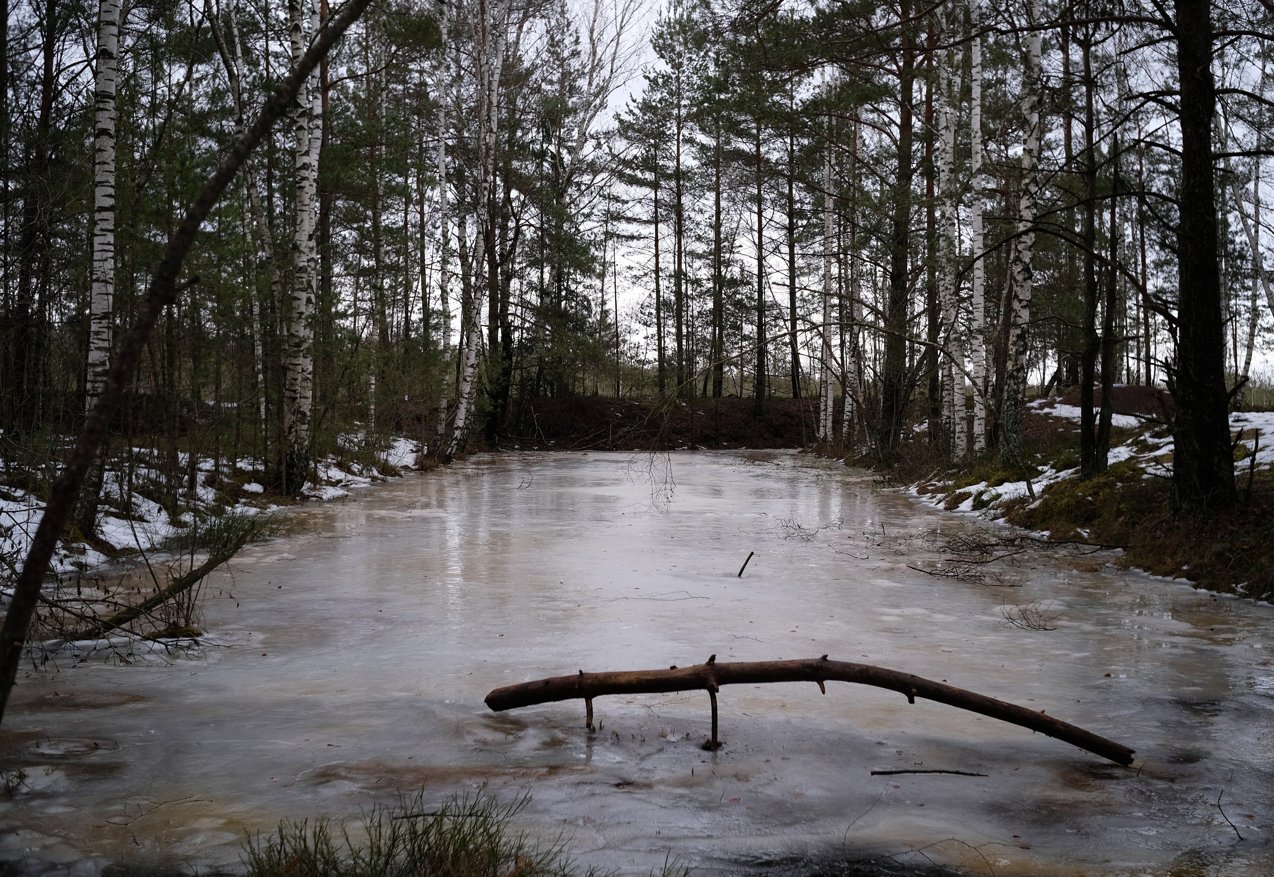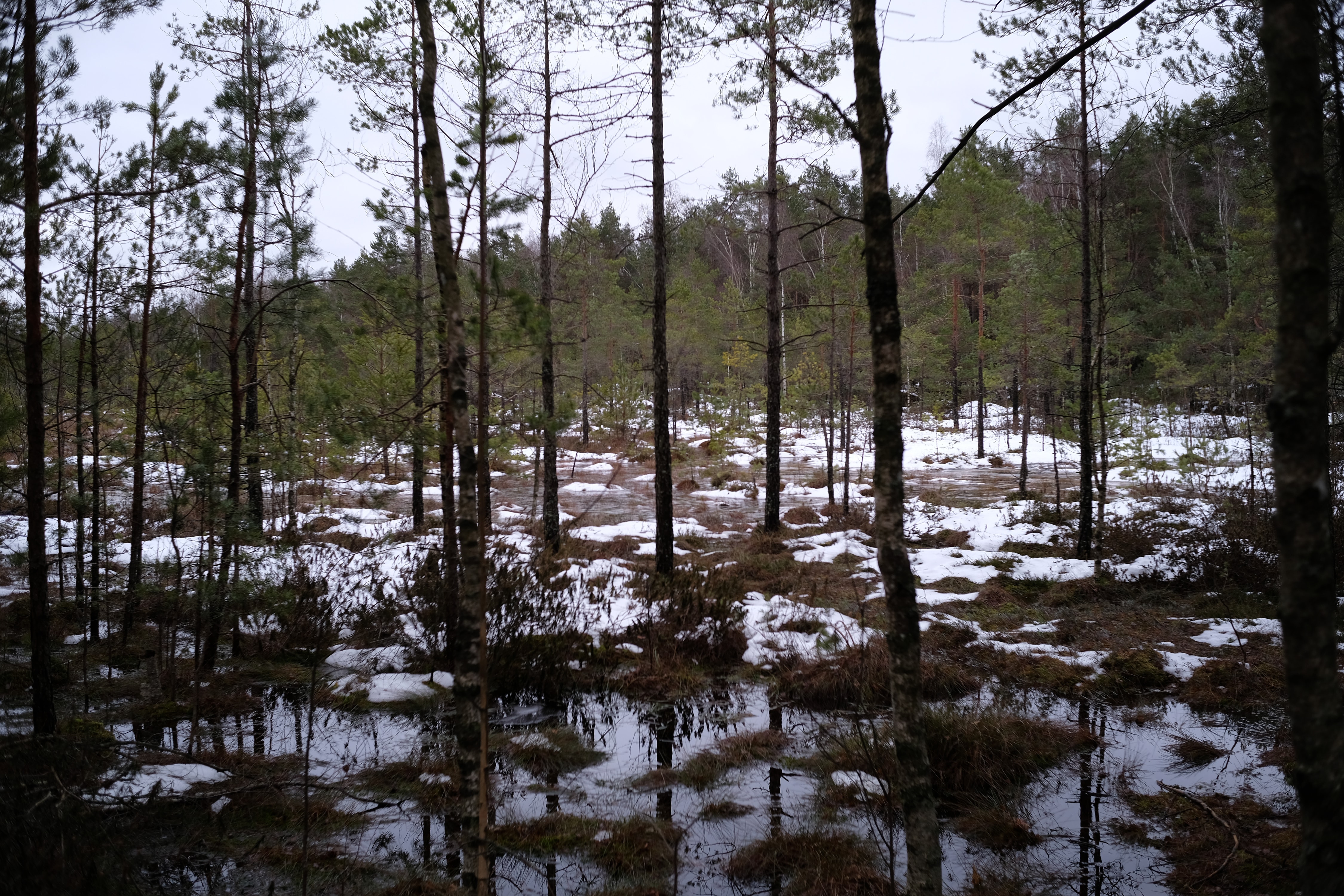 Несколько километров ползем по лесу который превращается в болото, то скользя по льду то выдирая берцы из чавкающей грязи, и дивимся на старые мелиорационные канавы - часть залита водицей доверху, часть наполовину, часть вообще сухая