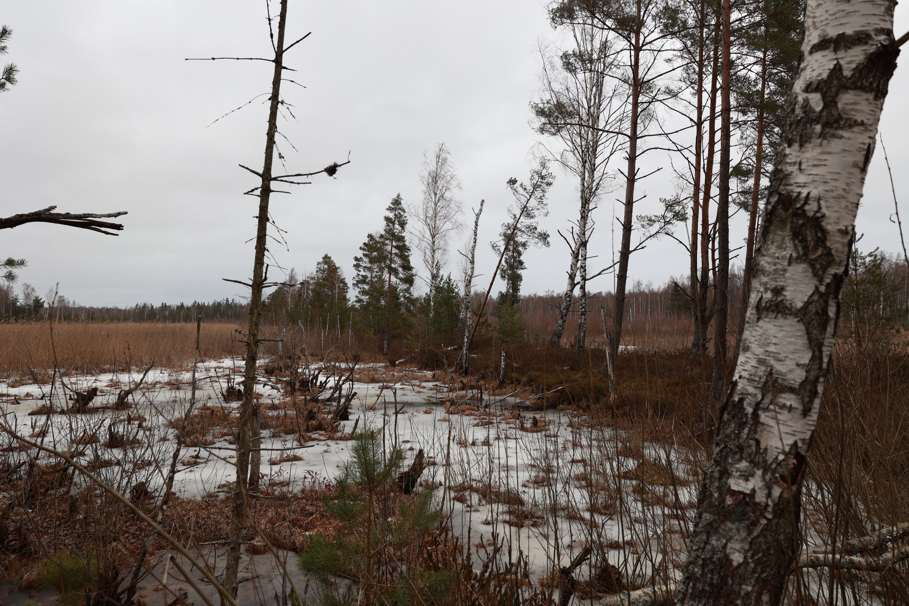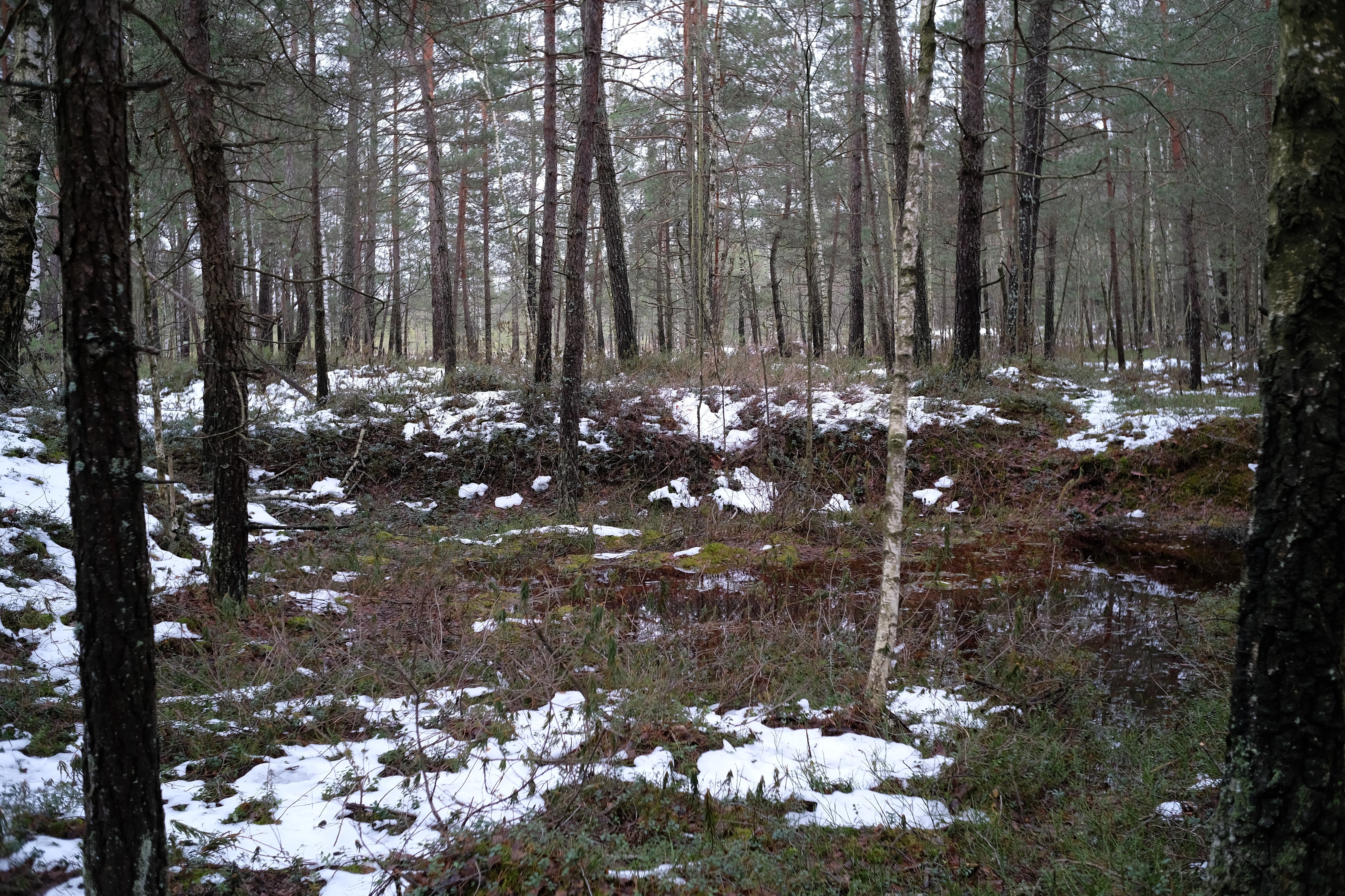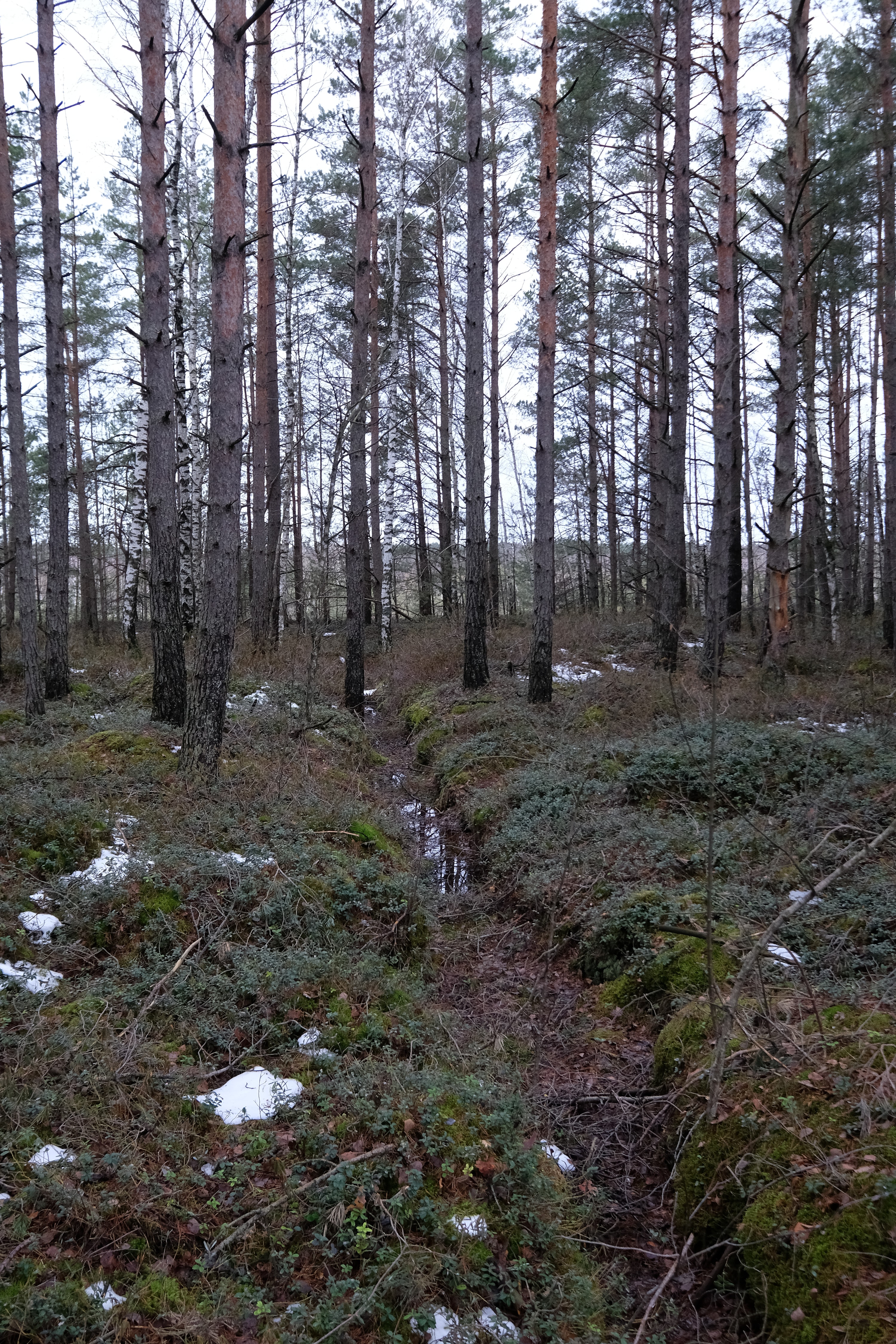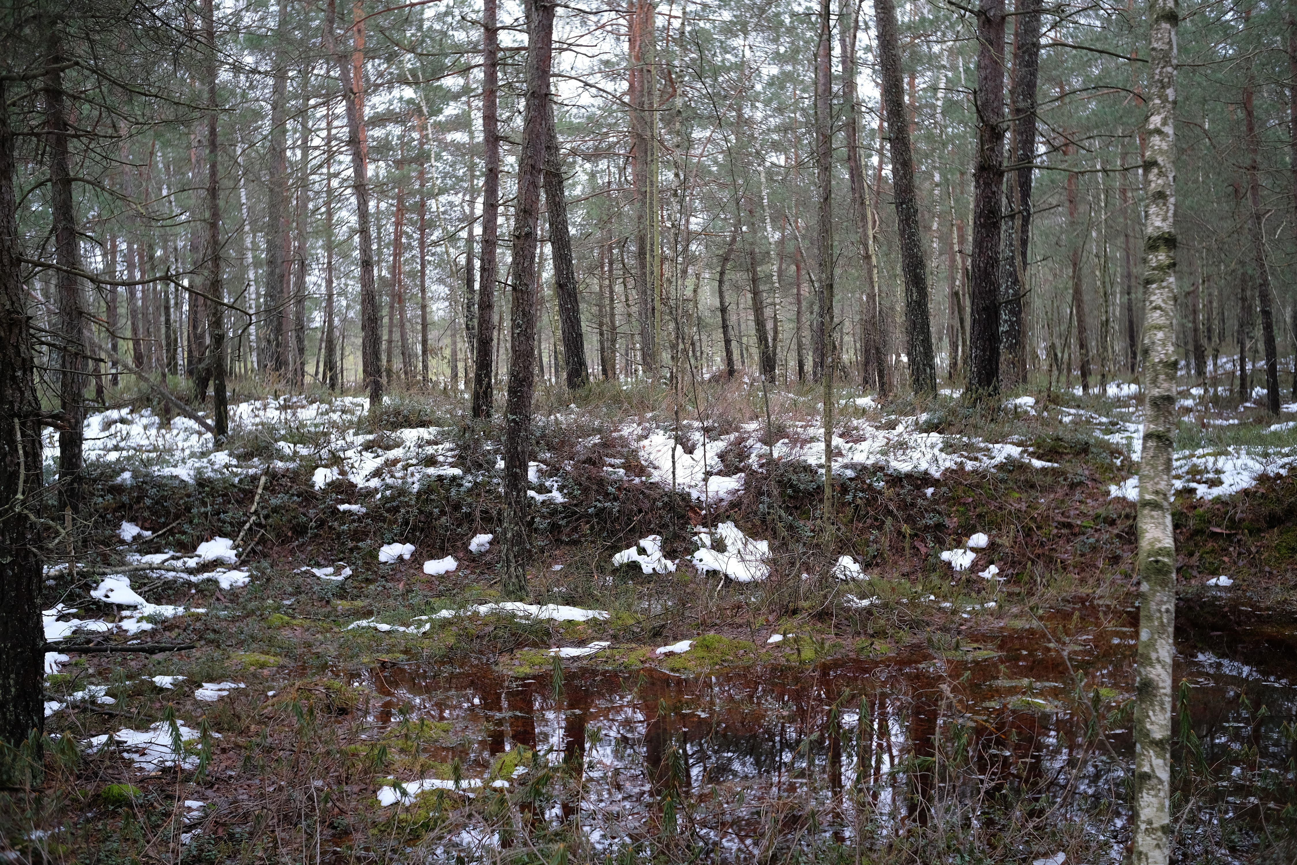 Несколько километров ползем по лесу который превращается в болото, то скользя по льду то выдирая берцы из чавкающей грязи, и дивимся на старые мелиорационные канавы - часть залита водицей доверху, часть наполовину, часть вообще сухая