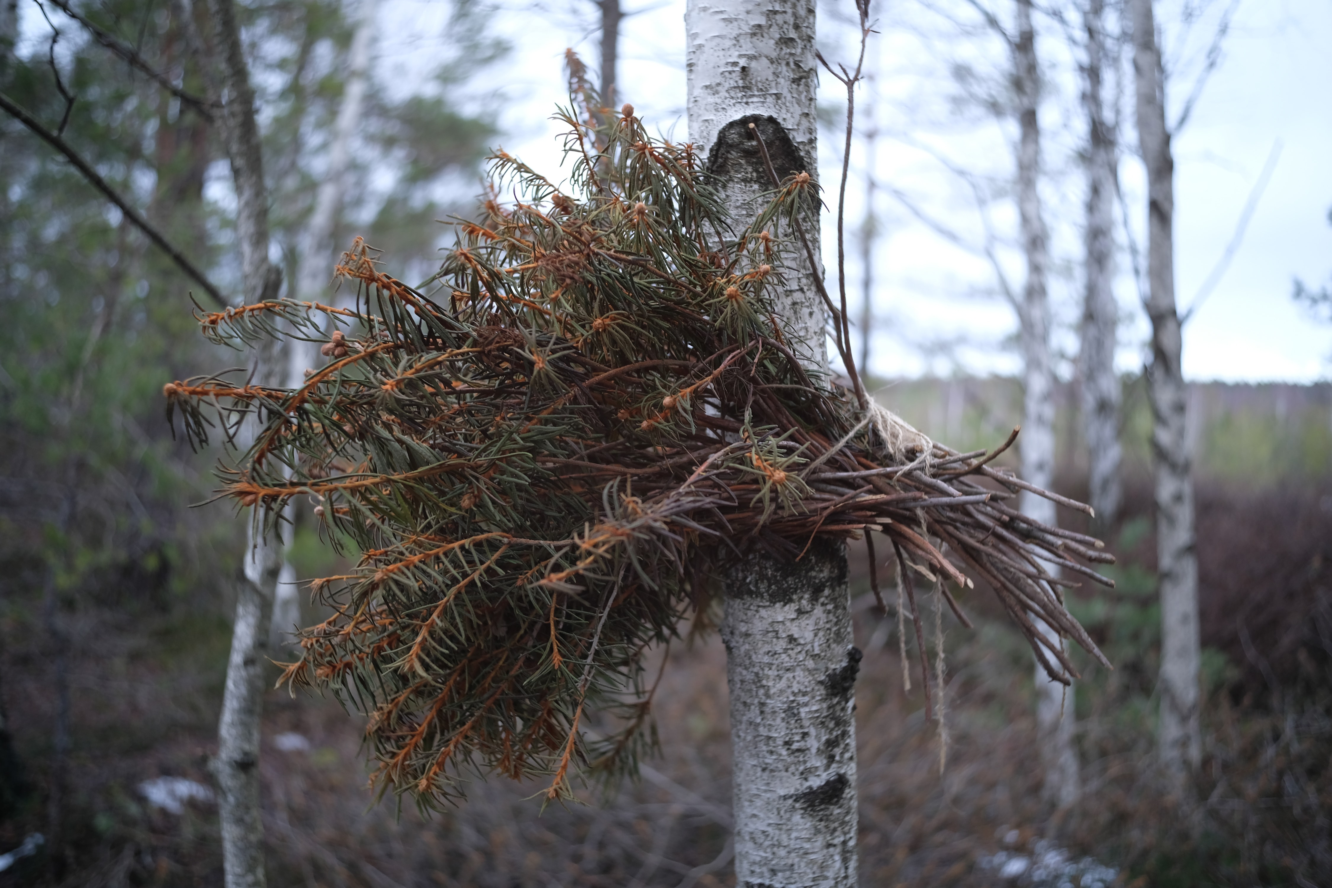 Понима что мне еще назад пиздовать через километры болота и леса, поэтому разворачиваюсь назад. Я устал, окончен бой, беру портвейн, иду домой и все такое. Место интересное, будем изучать. Шум в зарослях со следами животного крупного чуть дальше оставим на потом. Кто и зачем сделал венок из бес-травы и повесил его на березу - вопрос отличный, я не уверен что хочу встречаться с этими людьми. Ведовством крепка чёрная слава этих мест.