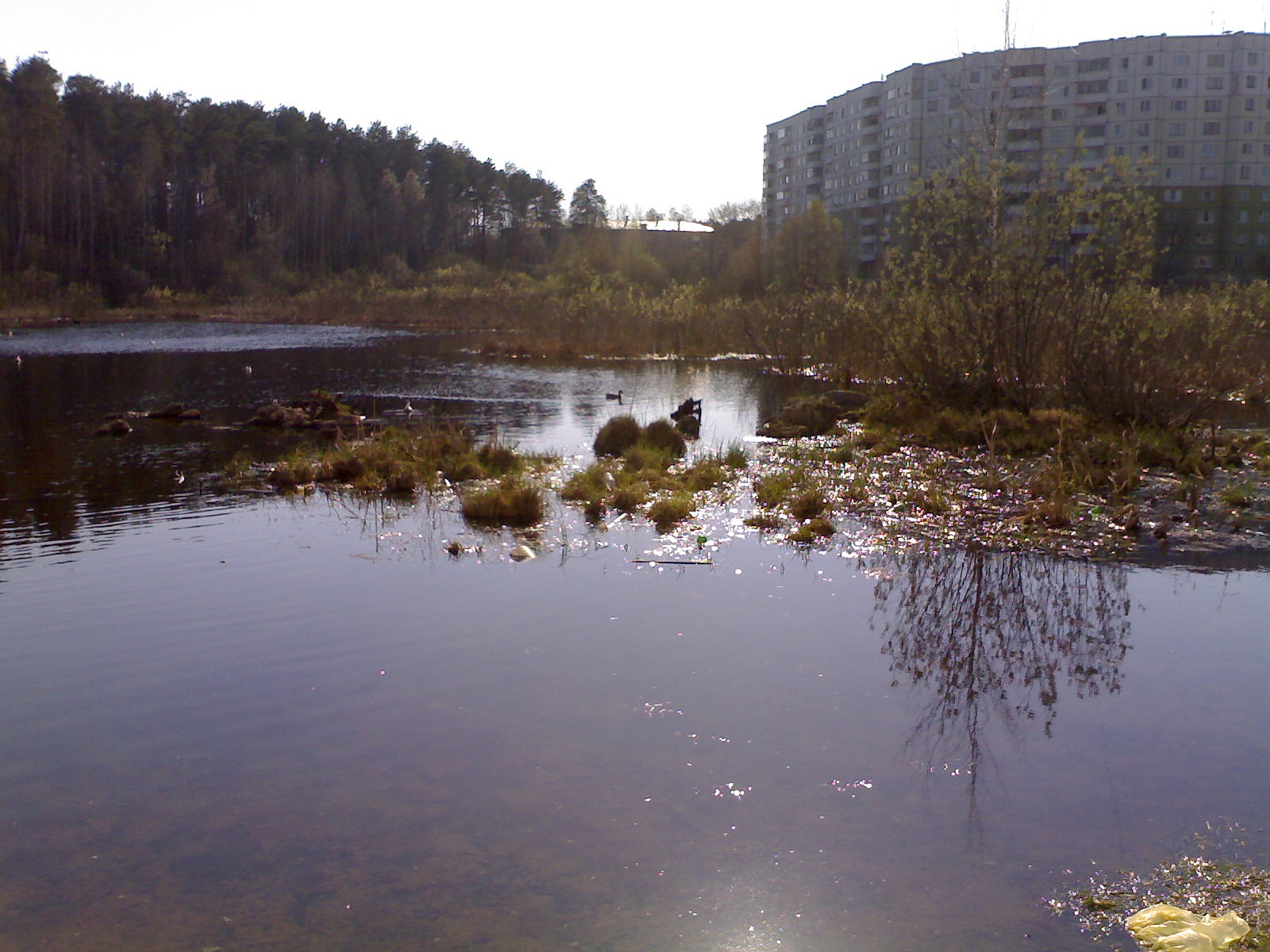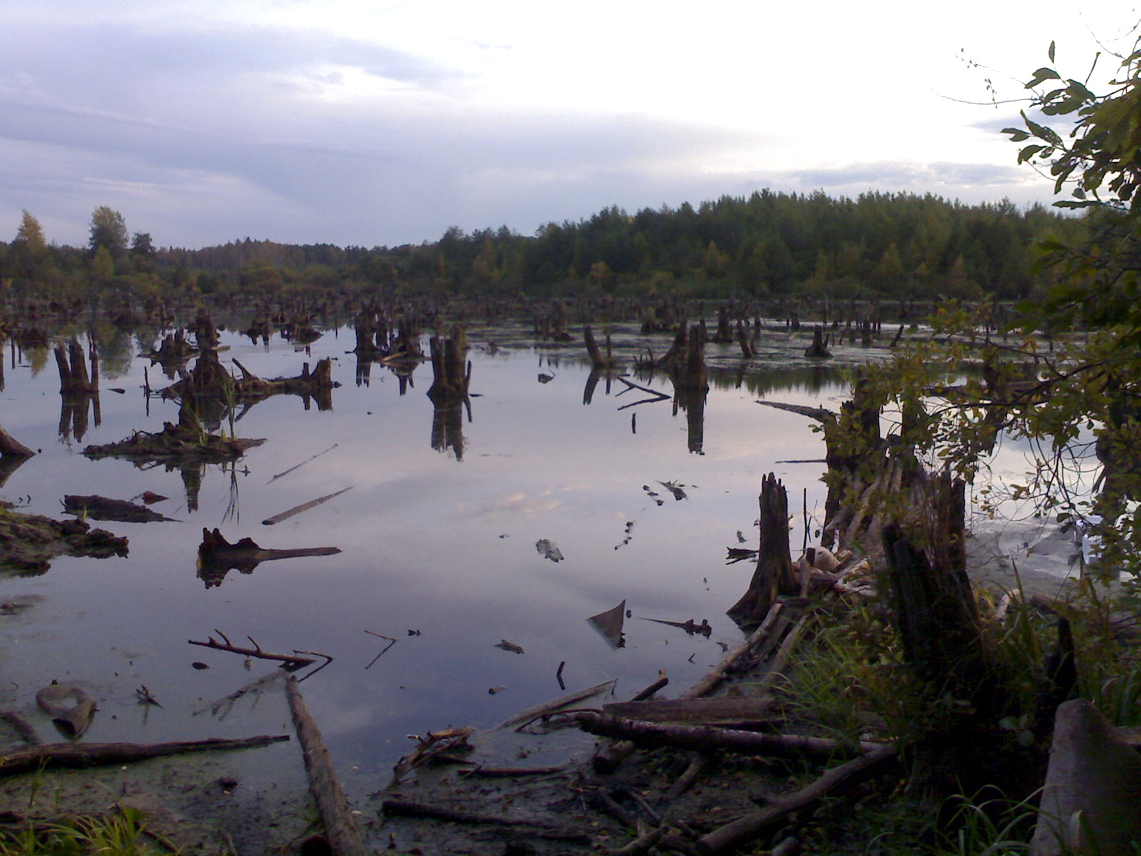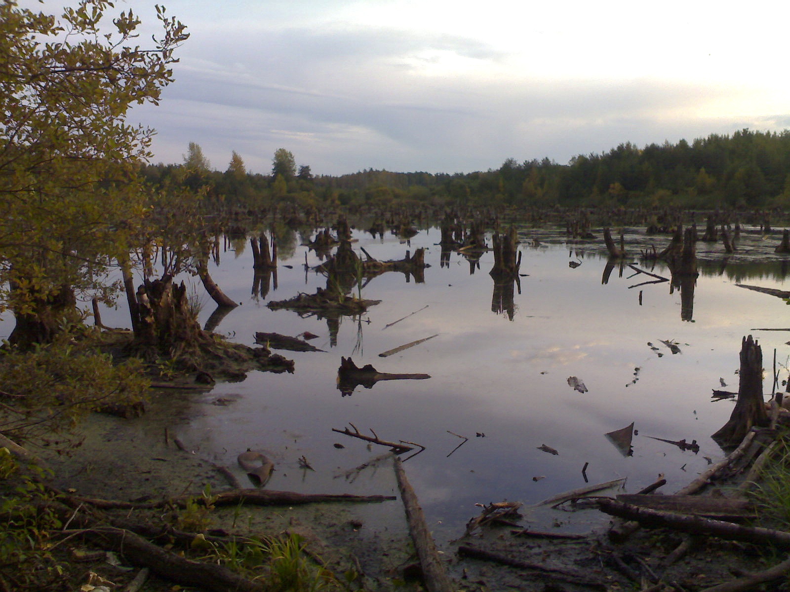 Чтобы вы понимали - рядом завалы деревьев и болотное озеро, кто и зачем это тут оставил - непонятно. Темнеет, да плюс еще и место где "темно". Выхожу к озерцу, стоять невозможно - начинаешь проваливаться в жижу.
