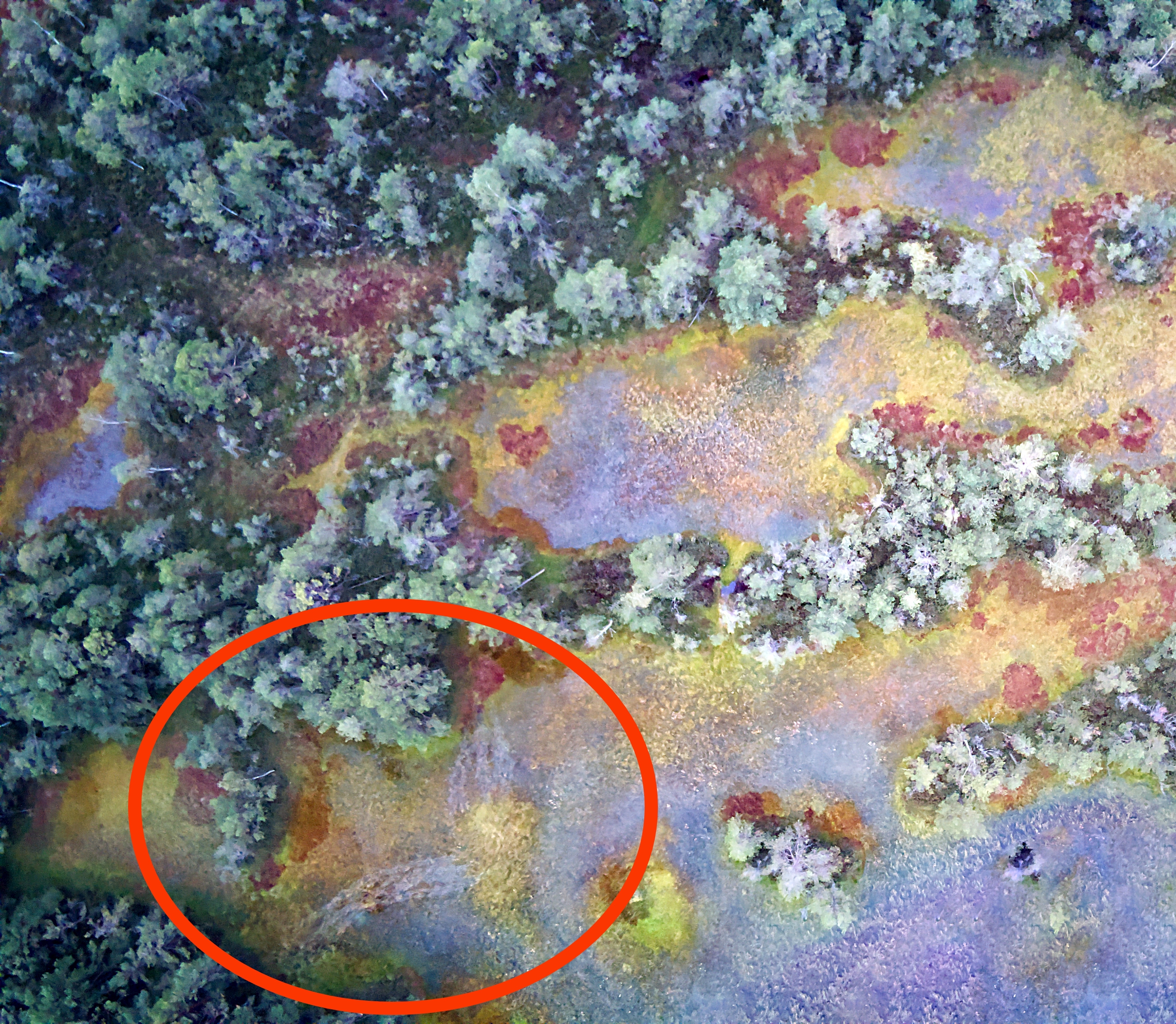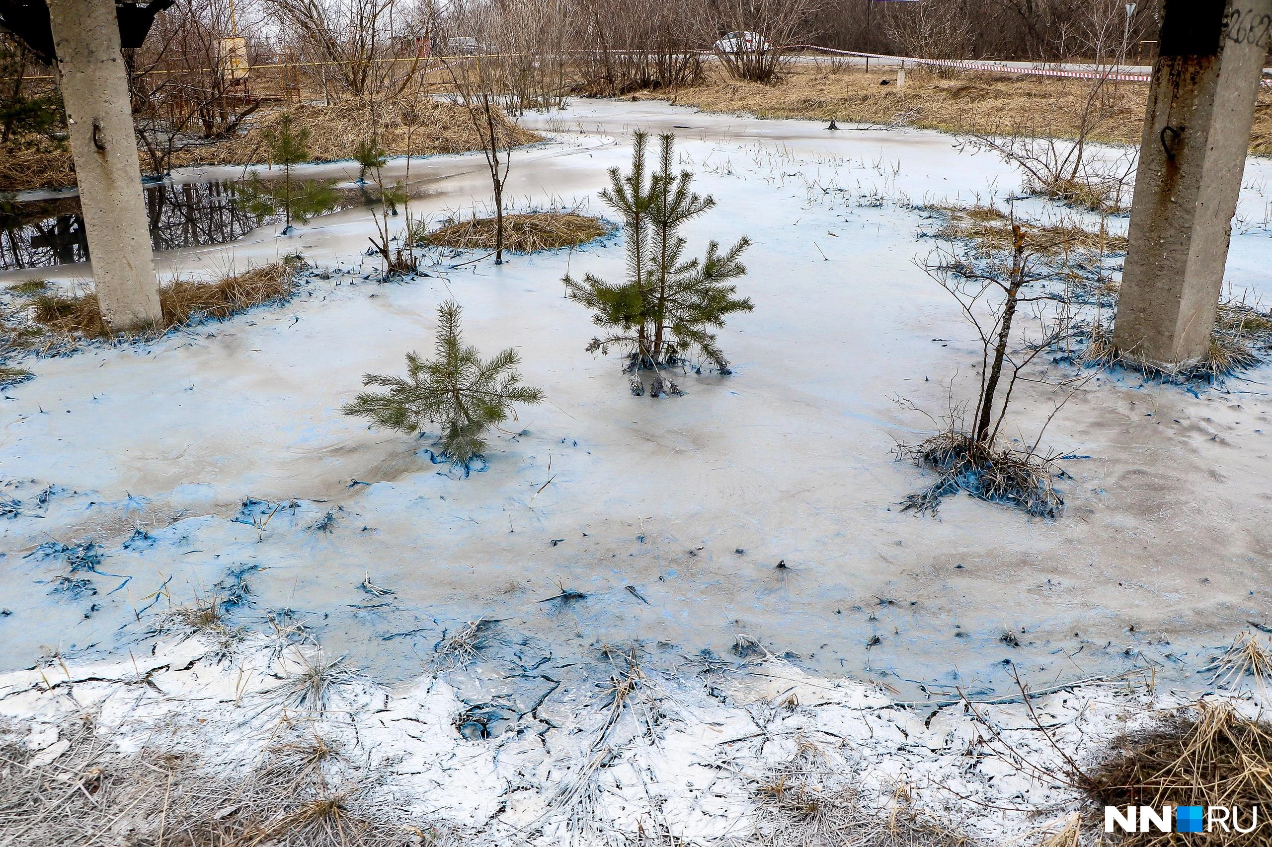 Там где светлая трава - под ней болото/сильно заросшие озера. Там где ярко-зеленая трава - это уже "вглубине" территории этой, поворот к месту.