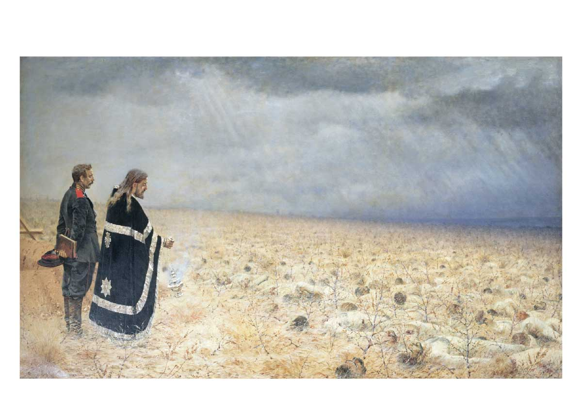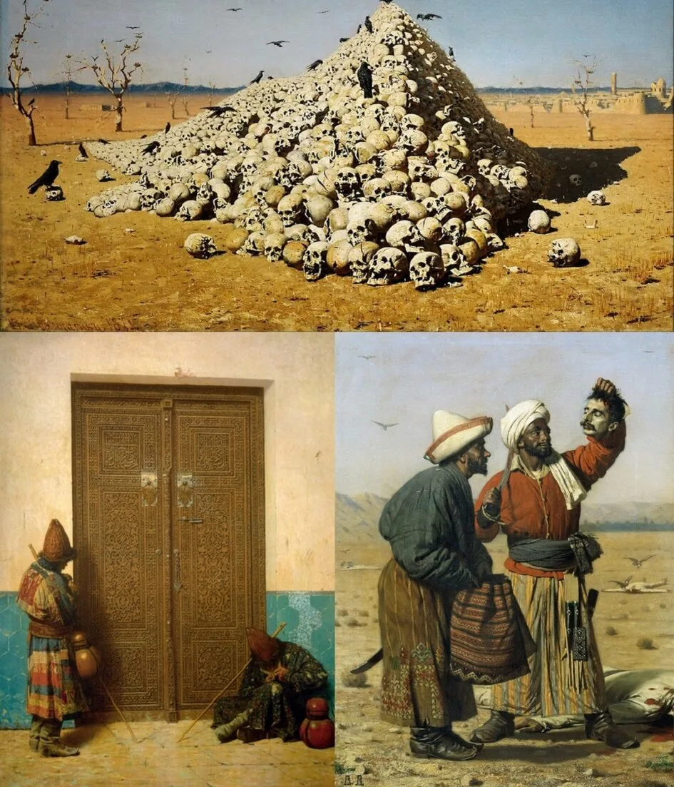 >>824403 (OP) Нас повели в первом классе (!) на выставку Верещагина. Гора черепов, поле с мертвецами, головы на пиках, военный парад на поле полном трупов. Это было страшнее, чем киноужастики, не знаю почему.