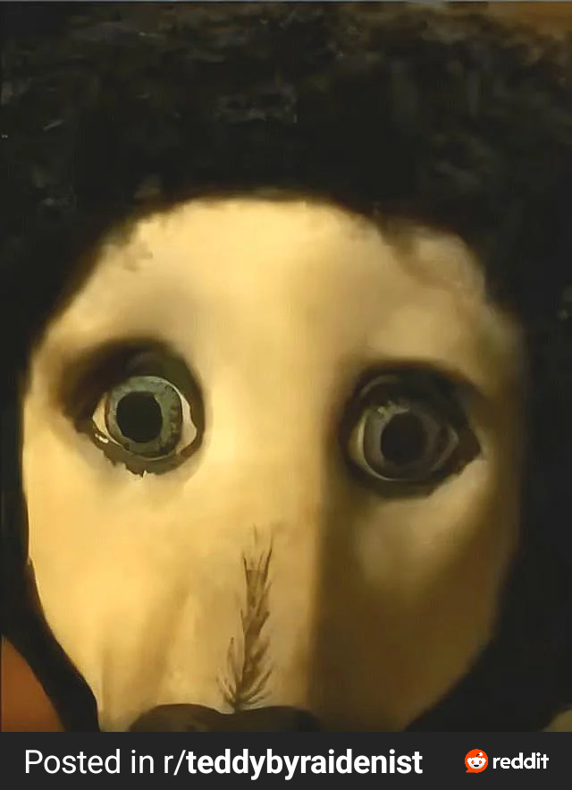 Привет, двачяне! Мы с испанцами и португальцами уже много лет бъемся над поиском информации об этом медведе из криппипасты "Тедди". Прошу помочь в поисках и сообщить любую известную вам информацию: кто автор, где она сделана, появлялась ли ранее на дваче и т.д. Даже создали сабреддит для поисков: teddybyraidenist. Не даёт нам покоя эта жуткая тайна. Всем добра!