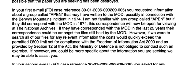 Наша история начинается с Дженни Рэндлс, уфолога, которая состояла в BUFORA (British UFO Research Association) и хотела создать новую ассоциацию – NUFON (Northern UFO Network), которая изначально состояла из трех групп: Манчестер, Уиррал и Ноттингэм. В 1974 году Рэндлс по почте получила часовую аудио пленку. На ней некий Дж. Т. Андерсон (говорящий с американским акцентом) представился верховным главнокомандующим APEN. Остальное время было забито различными отрывками из радио- и телерепортажей об НЛО, прерывающимися голосами (некоторые были уэльскими, некоторые словно пьяные), предупреждающими о враждебной настроенности пришельцев. Для пикантности, пленка была сдобрена отрывками из «нацистских маршей». После этого с декабря 1974 по апрель 1975 письма и пленки начали получать и другие организации и уфологи. Письма были напечатаны на бумаге с заголовком, присутствовали вымученные бюрократические «коды» ("Code=7 Case number 174L 74-71/349 ST Classification=Jasmine Clearance date=02 DE 74), обратного адреса письма не имели. Письма пытались показать APEN как серьезную секретную организацию, которая поддерживала объединение северных уфологических групп, но была против какого-либо сотрудничества с BUFORA. Когда в конце семидесятых BUFORA пыталась наладить прямой контакт с журналом Flying Saucer Review, такие же письма стали приходить касательно журнала. Одним из документов, рассылаемым APEN, была якобы внутренняя записка о посадке НЛО в Уэльсе, в которой, среди стандартной для APEN бюрократической галиматьи, были запросы о предоставлении людей и техники (лендроверы, инфракрасные и ультрафиолетовые сенсоры, стробоскопы) – еще одна попытка показать APEN как большую и серьезную организацию. Именно этой запиской APEN привлекла внимание британских уфологов к инциденту в горах Бервин в Уэльсе. До этого о нем знали только местные жители и правительство, по некоторой информации небольшая заметка об инциденте была напечатана в журнале Flying Saucer Review (!) до записки APEN. В октябре 1975 года в дом Питера Боттомли, уфолога из Манчестера, наведались два мужчины, представившихся как агенты APEN, своих имен они не называли. Они объяснили, что их секретная организация (желающая такой и оставаться) хочет найти нейтрального человека для связи с остальными уфологами. Этим человеком они выбрали Боттомли. Ему дали адрес, незарегистрированный телефонный номер и личный опознавательный код. Они пообещали, что все его затраты во время помощи в расследованиях будут покрыты сполна. После разговоров с женой и другими уфологами (репутация у APEN уже была довольно плохой), Боттомли решил отказаться от сотрудничества. Через несколько недель к нему домой позвонил «агент APEN», Боттомли отказался от сотрудничества с ними. Дальнейших контактов с APEN у него не было. Одним из уфологов, которые предостерегали Боттомли от контакта с APEN, была Дженни Рэндлс (которая, судя по всему, первая получила корреспонденцию от APEN). Через несколько недель после разговора с Боттомли, она переехала. По новому адресу ее ждала открытка от APEN, поздравляющая с новосельем. Внутри было написано «Никогда не называй кого-либо больше себя глупым». APEN проводили набор в свои ряды через объявления в газетах, подписывая их именем Дженни Рэндлс. Неизвестно, были ли это реальные попытки, либо очередная их «шутка». В офис уфологов из Восточного Мидленда (по некоторым данным в самом Ноттингеме) кто-то вломился н