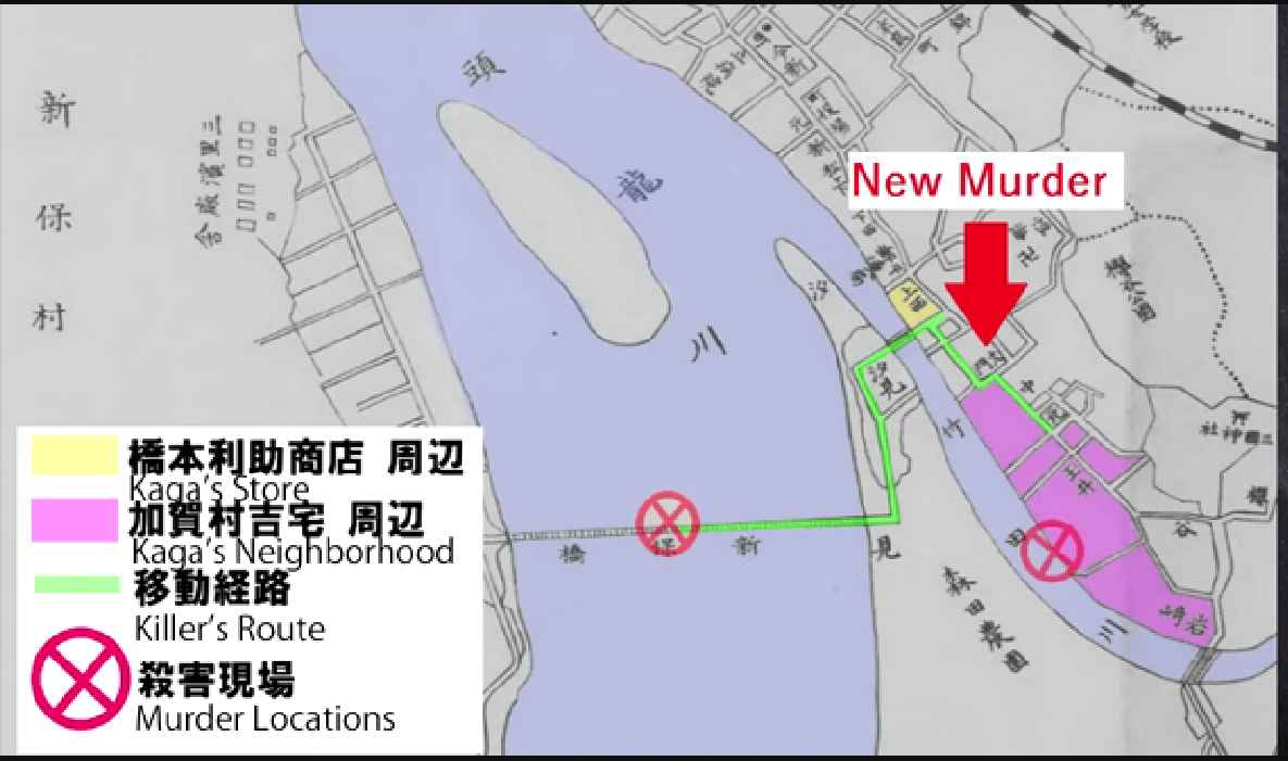 Муракичи Кага, 30 лет от роду, проживал в городке Микуни (теперь в составе Сакай Сити) в префектуре Фукуи, был женат на 25-летней Цуи, которая родила от него ребенка. Муракичи владел магазинчиком, обслуживающим корабли, был в городе на хорошем счету, не употреблял алкоголя. 11 февраля 1906 года, на улице бушевала пурга. Примерно в пять утра в магазинчик к Муракичи вошел человек, с головы до ног закутанный в синее одеяло. Не обращая внимания на работников магазина, он сразу обратился к Муракичи. Незнакомец уверял, что тете Муракичи нездоровится и ему нужно поспешить к ней. Муракичи сначала не поверил незнакомцу, но тот не отставал и, в конце концов, Муракичи сдался и пошел вместе с ним. Последний раз его видели вместе с незнакомцем возле моста через реку. Через два часа, в дверь дома Кага постучали. Кику, 59-летняя мать Муракичи, открыла дверь – на пороге стоял человек закутанный в синее одеяло. Кику сразу поверила в рассказ незнакомца об умирающем родственнике в соседней деревне и поспешила за ним. Последний раз ее видели у того же моста с незнакомцем. Еще через час в дом снова постучали. На этот раз незнакомец выманил жену Муракичи, которая пошла с ним проведать умирающего родственника. Судя по всему, незнакомец узнал о ребенке только во время это прогулки, т.к. через 40 минут он появился на пороге соседского дома, в котором присматривали за ребенком. Он снова разыграл свой спектакль перед соседкой, сказав что его послали за ребенком, а вся семья находится у умирающего родственника. Соседка наотрез отказалась отдавать двухлетнего ребенка незнакомцу. Она была непреклонна и незнакомец, потеряв терпение, обругал ее и ушел. Утром 12 февраля местный плотник шел на работу по мосту и наткнулся на большое кровавое пятно, кусок перил моста был вырублен топором. Прибывшая полиция, осмотрев место, пришла к выводу, что на мосту кого-то убили, а от тела избавились, сбросив с моста в воду. Рядом с домом Кага они нашли прибитую лодку с кровавыми следами на борту. Ниже по течению они нашли тело Цуи. Все указывало на то, что убийца заманил ее на лодку и во время переправы убил ее, а тело сбросил в реку. Местная полиция не была подготовлена к такому серьезному делу, поэтому они запросили помощи у полиции префектуры. 14 февраля тело Кику было найдено в эстуарии (устье реки, впадающее в океан). Найдя тела жены и матери, полиция начала подозревать в убийствах самого Муракичи, но эксперт, обследовавший мост, заключил, что крови было слишком много для одного убийства, поэтому, скорее всего, Муракичи был убит там же, а его тело унесло в океан. Опросив работников магазина и соседку, полиция узнала о мужчине в синем одеяле. На вид ему было лет тридцать, его голова была покрыта полотенцем, а тело завернуто в синее одеяло. Никаких особых примет очевидцам разглядеть не удалось. Он говорил спокойным тоном, только когда соседка отказалась отдавать ему ребенка, он вышел из себя. Опросив всех родственников, установили, что никто из них не болел и не посылал за Муракичи и его семьей. Каких-либо явных врагов или недоброжелателей установить тоже не смогли. Рабочей версией была зависть, т.к. бизнес у Муракичи был довольно успешным, а его жену Цуи называли красивой, но ни подозреваемых, ни следов, ни орудия убийства найти не удалось. 25 июля 1910 года, недалеко от дома Кага, 26-летний сын владельца мага