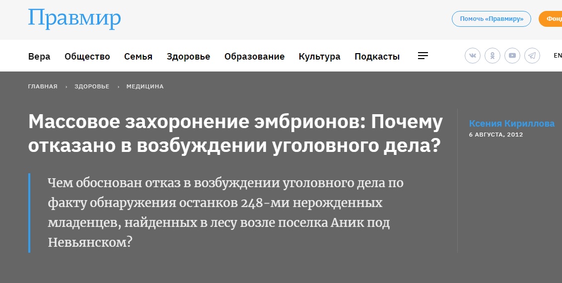 Полицейскими было установлено, что найденные эмбрионы практически мумифицированы, их смерть наступила на 22 — 26 неделе беременности. Также в лесном овраге были найдены 113 бирок с наименованиями лечебных учреждений, конкретными датами и фамилиями женщин.