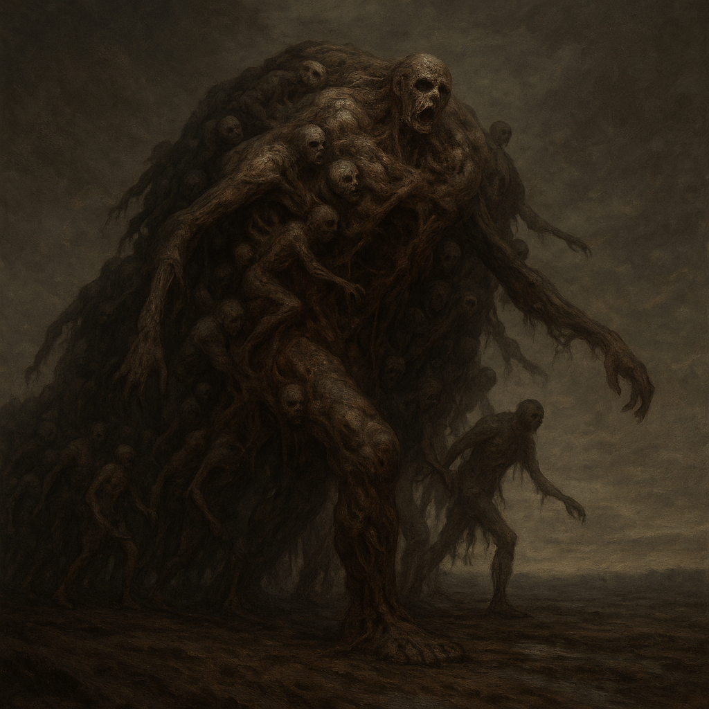 Трупоход фрагменты разговоров, допросов, радиоперехватов и случайных записей ⸻ …поначалу показалось, будто земля ползёт. Как холм, только с венами. А потом стало видно — это не земля. Это кожа. Гниющая, натянутая на кости, чужие, не свои. Пальцы — сотни пальцев — хватались за грунт, тянули тушу вперёд. Она шла. ⸻ …не ноги у него. Колонны из тел, обмотанные кишками. Челюсти шевелятся, но не говорят. Руки, словно ветки, цепляются за воздух. А в центре что-то тёмное, как будто сердце, но больше, с лицами. Лица тоже мёртвые, но они смотрят. ⸻ …сняли с дрона: движется медленно, но непрерывно. Пульсация по всей массе — как будто оно дышит. На кадрах видно, как нижние тела стираются об землю, разрываются, а новые выталкиваются изнутри. Само себя заменяет. ⸻ …никаких криков. Только хруст и шорох. Ни одна птица не поёт. Как будто лес слушает, как оно идёт. ⸻ …ночью не спал. Слышал шаги. Не как у людей. Тяжёлые, будто кто-то волочит что-то огромное. Потом — тишина. А утром — в земле ямы. Прямоугольные, с кровью. Ни следов, ни тел. Только запах. ⸻ …пахнет сыростью, металлом и кровью. Старой кровью. Но свежий тоже есть. Как будто оно собирает всё, что находит. Добавляет к себе. Швы видны — не нитки, а кости, переплетённые, как корни. Всё держится, всё едино. ⸻ …я не понимаю, как оно держится. Это же не живое. Но оно хочет идти. Это желание видно. Всё в нём — это движение. Не цель. Сам процесс. Как будто идти — и есть смысл. ⸻ …подошёл ближе. Не знаю зачем. Было чувство, что нужно. Что там — моё. Узнал лицо. Одно из сотен. Мой брат. Он умер десять лет назад. Я помню это. Но он был там. Открывал рот, как будто звал меня. ⸻ …оно не убивает. Оно зовёт. Не голосом — внутри головы. Звучит как шаги. С каждым днём громче. Вначале можно не обращать внимания. Потом уже невозможно. ⸻ …если оно дойдёт до города — не знаю, что будет. Оно слишком большое. Оно не ломает — оно переплавляет. Всё, к чему прикасается, становится им. Камень, плоть, дерево — неважно. Оно это собирает. ⸻ …самое страшное — не вид. Самое страшное — это ритм. Оно движется в ритме. Не сбивается. Не замедляется. Как метроном смерти. В этом ритме есть что-то… древнее. Как будто земля его помнит. ⸻ …я видел, как младенец — труп младенца — был встроен в позвоночник. Просто как звено. Он не плакал. Он смотрел. Прямо в меня. И я понял: оно меня помнит. Хотя я никогда его не знал. ⸻ …шаг — скрежет. Шаг — влажный хлюп. Шаг — хруст костей. Потом снова. Снова. Снова. ⸻ …и даже если вы сожжёте его — оно всползёт. Из почвы, из тел, из памяти. Это не чудовище. Это путь, принявший плоть. Он идёт. Он будет идти. Пока есть куда.