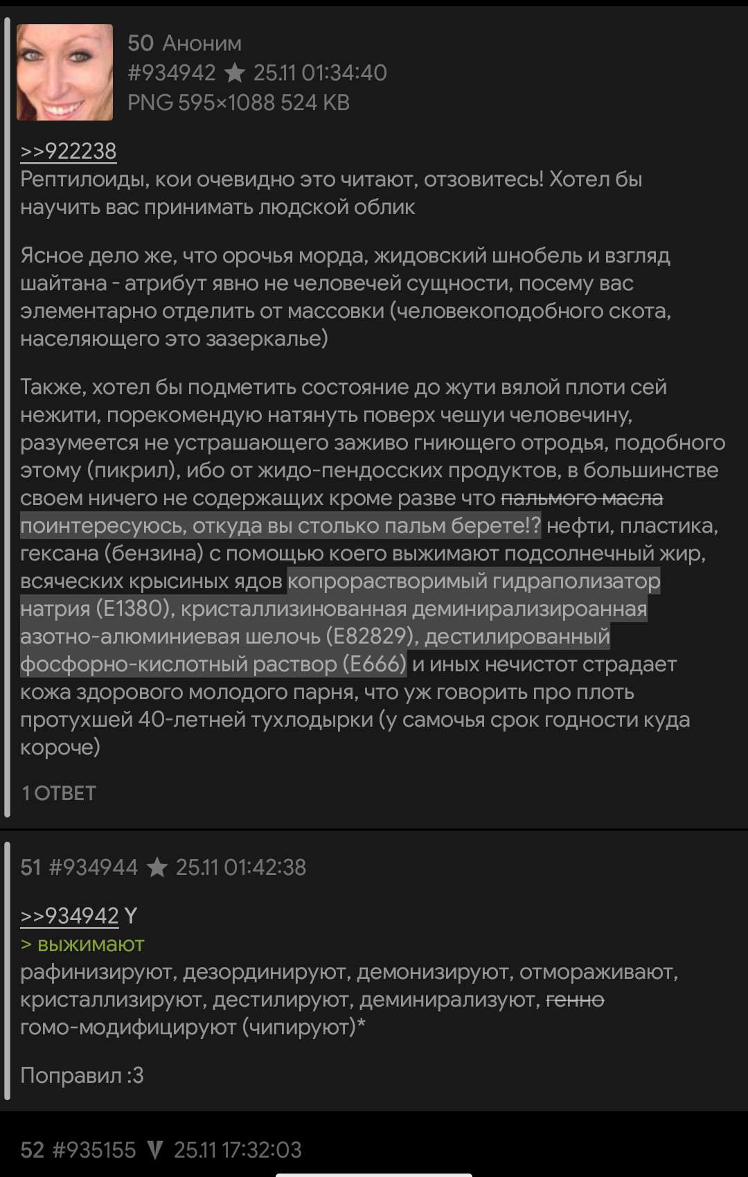 >>870679 Я тебе больше скажу. У меня на работе женщина есть, инженер по образованию и по должности. За 50 лет, дети взрослые давно уже. И она многих уже задолбала своими конспирологическими и шизоидными историями, особенно про рептилоидов и про всяких Рокфеллеров. И мало того, она на, полном серьёзе верит в стандартный набор шиза - про климатическое оружие, про вышки 5G, и прочее прочее.