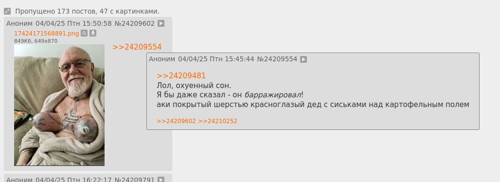 >>854222 Был суровым старцем, от одного крика которого копытная нечисть полями драпает. >засветился в фагаче >покрытый шерстью красноглазый с сиськами Стал упоротым фурри-трапом. Охуенно канонично. Не было у него никаких описаний. Тупо срали под каждым постом, пока в бан-лист не попали. До сих пор аукается.