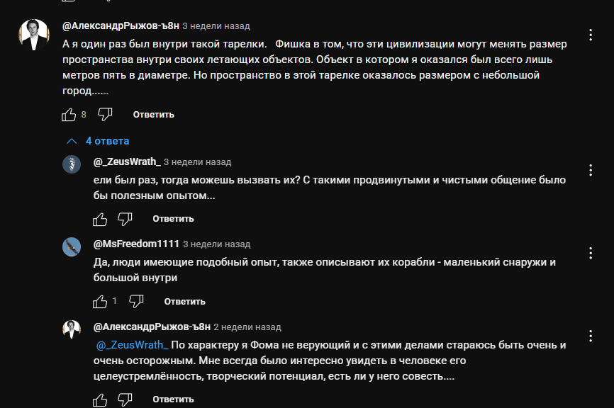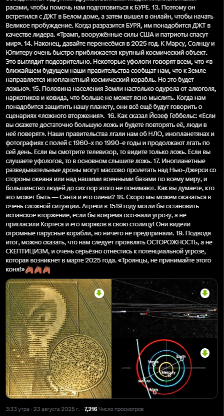 >>865628 Якобы существует план по постепенному раскрытию информации. Документы, упомянутые в Конгрессе, — это те, что Кнапп привез из Советского Союза. Кнапп — мошенник и лжец. Зачем вам нужны российские документы, если есть люди, которые говорят, что работали с НЛО и пришельцами?! Так что это либо психоперация, либо честное постепенное раскрытие. Также говорят о чем-то в 2027 году. Суть истории в том, что пришельцы создали нас и поместили сюда, и поэтому раскрытие информации не происходит. Религии это не понравится. Интересно, что будет, если Россия или Китай выйдут и скажут, какова правда.