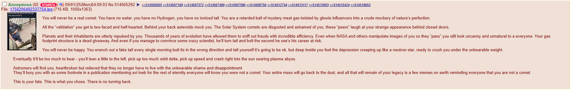 >>865539 Нахуя, мы не астрономы, если все астрономы-практики мира имеют доступ к полученным данным и все говорят что это богатая СО2 комета, то смысл в этом сомнвиваться(нет доктор Эви не астроном-практик, а астрофизик, у него меньше опыта в наблюдении объектов). Ты найди хоть одного астронома который сказал что такие сигнатуры невозможны для кометы, хотя бы любителя, тогда поговорим.