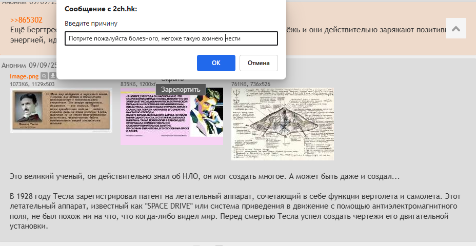 >>864377 >Тут практически одни шизы сидят, сейчас начнут околорептилоидную хуйню задвигать. Типичная ошибка: на самом деле ты не знаешь кто тут сидит. А если половина сообщений от шиза, то вполне может быть от одного(скорее всего так и есть). Что известно нам, реалистично мыслящим людям: НЛО есть, мифология людбого древнего нароода содержит элементы похожие на контакты и прогрессорство, существуют вредные воздействия самих НЛО которые зафиксированы медицински, есть феномен похищения, но его трудно изучать. Если обсуждать исключительно это, то окажется что постить нечего, а шизам всегда есть что запостить, вот и возникает дисбаланс.