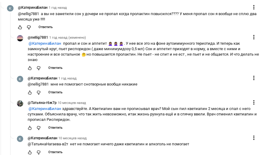 >>875787 Похожий случай у некой Катерины Билан. Пишет в комментах под видосами про нейролептик рисперидон про то что у неё абсолютно пропал сон после "лечения" этим препаратом