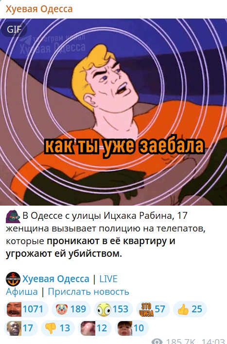 Родичи из деревни недавно рассказали историю. В 3-х домах от них живёт ебанутая бабка, которая уже много лет чудит и доёбывает соседей. Но без какой-то совсем уж неадекватной чернухи. Вот недавно эта бабка вызвала скорую для своей соседки, которая "упала посреди двора и встать не может". Скорая приехала, бабка вместе с врачами к соседке - а там никого нет дома (и во дворе никто не лежит). А дальше классика - соседка возвращается домой и такая: а хули тут происходит? А та бабка перед ней и врачами встала, сложила руки в молитвенном жесте и начала причитать: "Я тут во дворе чё-то делала, слышу - вроде стоны какие-то с твоей стороны, жалобные такие всхлипы. Ну я и представила, как ты упала во дворе, лежишь, бедная, и никто тебе помочь не может..."