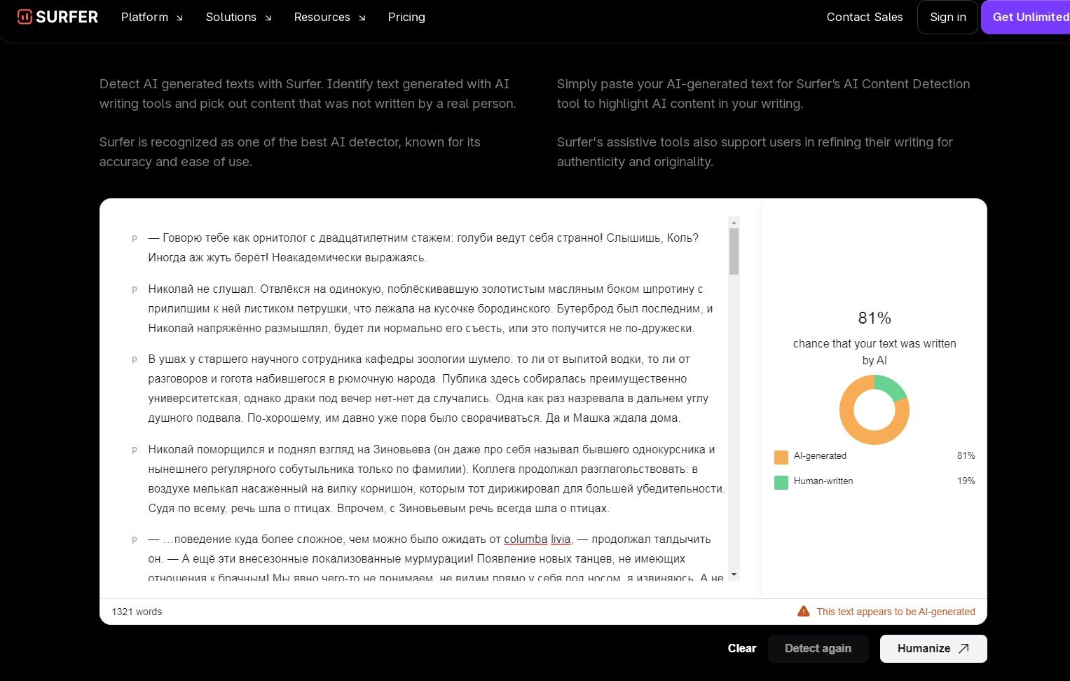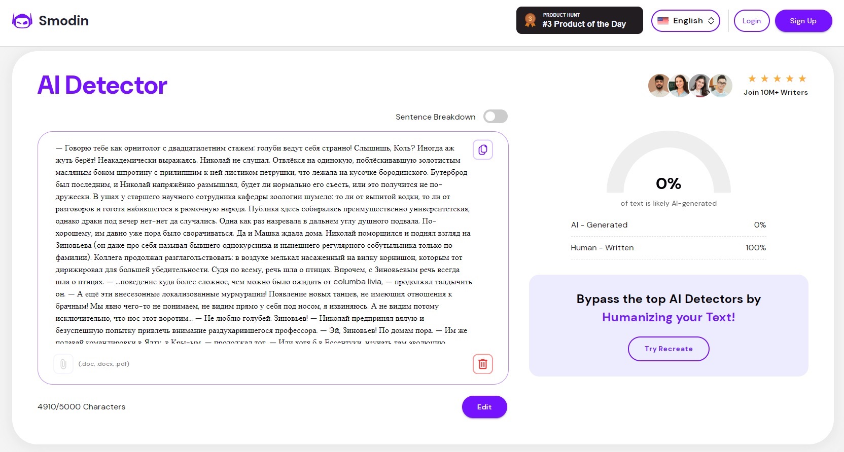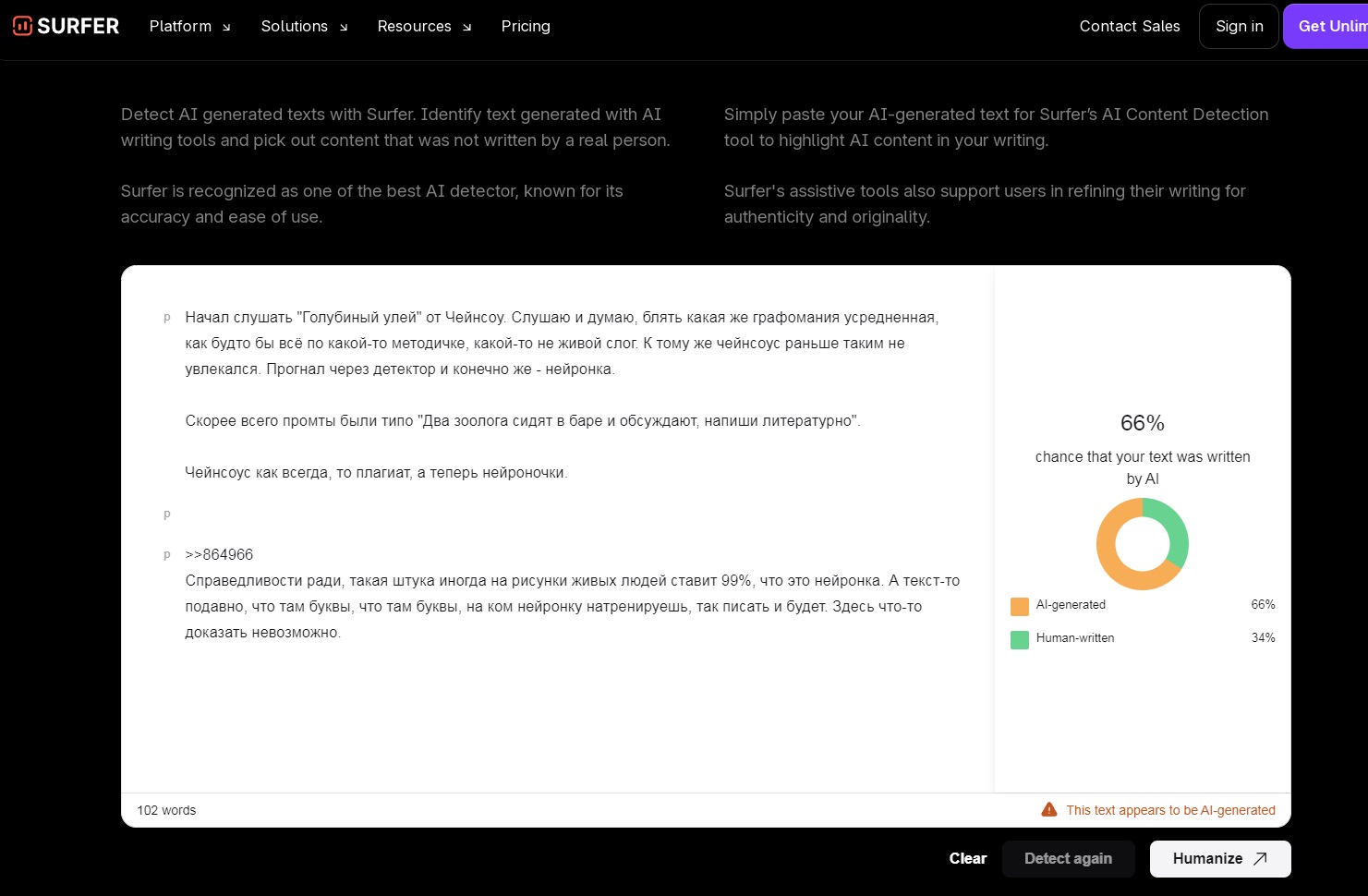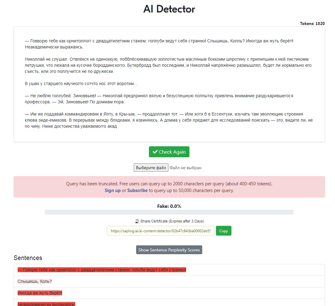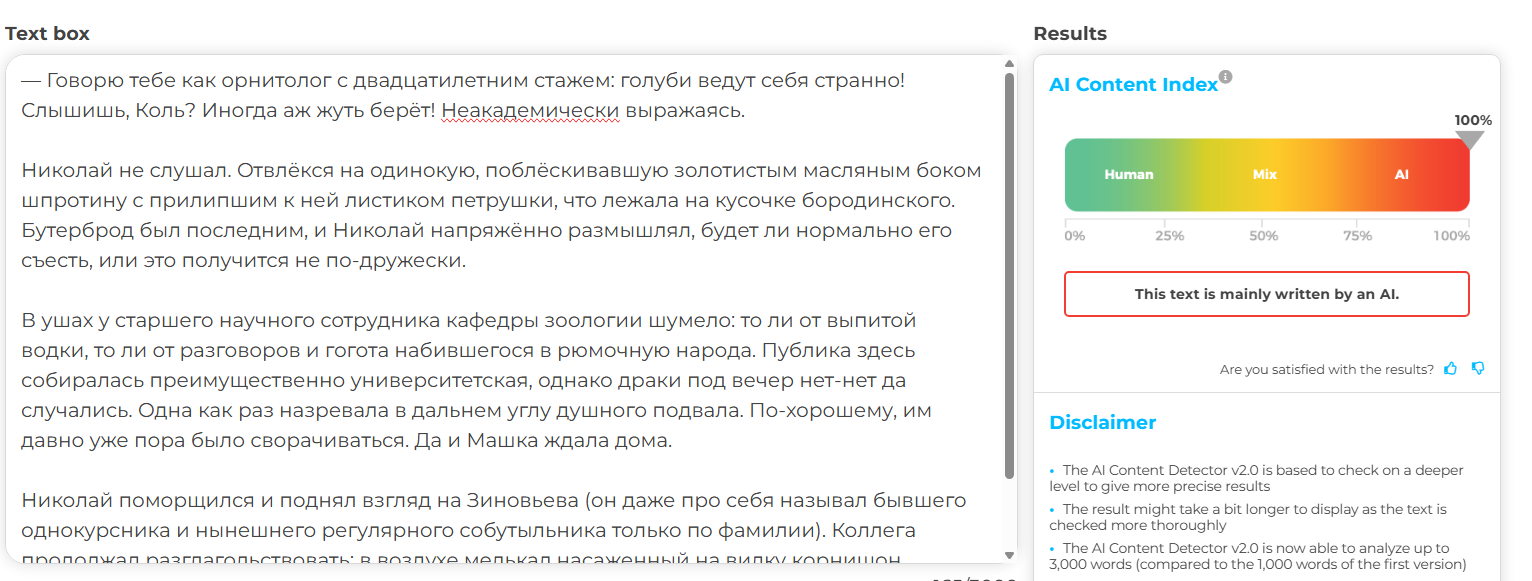 Начал слушать "Голубиный улей" от Чейнсоу. Слушаю и думаю, блять какая же графомания усредненная, как будто бы всё по какой-то методичке, какой-то не живой слог. К тому же чейнсоус раньше таким не увлекался. Прогнал через детектор и конечно же - нейронка.