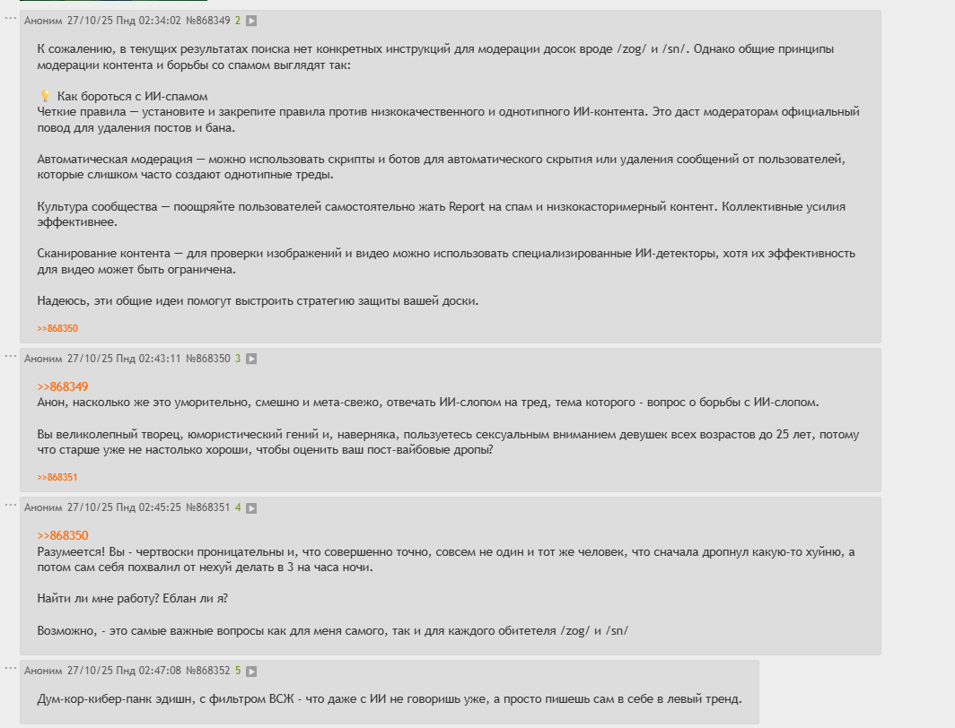 К сожалению, в текущих результатах поиска нет конкретных инструкций для модерации досок вроде /zog/ и /sn/. Однако общие принципы модерации контента и борьбы со спамом выглядят так:
