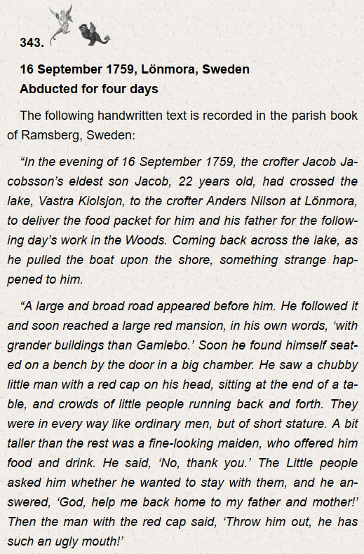 Мой дядя в детском возрасте и его бабушка, независимо друг от друга предсказали его смерть. Вскоре он поехал к родственникам в деревню, странно исчез за день до летнего солнцестояния и был найден мертвым на берегу озера вместе с его велосипедом там, где до этого уже искали. Признаков насильственной смерти не обнаружили. Его родители не согласились на вскрытие. Когда я в детстве один раз видел сказочных гномов и меня вырывало от страха, у них тоже были заостренные шапки и обувь, главный гном тоже был пухлым с животиком.