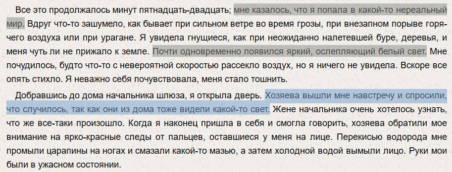 >«Первые минуты пребывания в комнате сопровождались ощущением мощного воздействия на барабанные перепонки, что вызвало звуковой эффект, напоминающий гул работающих двигателей реактивного самолета. Вчера медитировал, думал о случае с Егором, потом у самого аккуратно в два этапа заложило левое ухо и я ясно услышал мелодичный, почти поющий подростковый женский голос сказавший, что всё так и случилось. А ведь ровно неделю назад мне тоже приснились девушка и худой мужчина в тени, до того как я прочитал об истории Егора. А норми потёр мой пост.